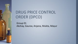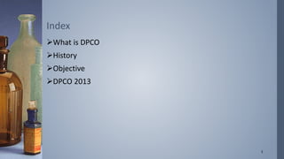 The document discusses the Drug Price Control Order (DPCO) in India. DPCO enables the government to regulate prices of essential drugs and formulations. It aims to ensure availability of life-saving medicines at reasonable prices. DPCO 2013 brought 348 drugs and their 652 formulations under price control and set ceilings based on the average market price of drugs with over 1% market share. It reduced margins for wholesalers and retailers while allowing annual price increases for producers in line with inflation. The order does not cover patented drugs and aims to promote cost-effective production and rational drug use in India.