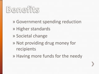 The document discusses a proposal to reduce government spending on welfare by requiring drug tests for recipients and reimbursing them only if they pass. It would save money by not providing funds to those who test positive for drugs. Statistics on total aid spending in San Bernardino County from 2008 to 2011 are provided, which show an increase over time. The proposal aims to eliminate this rise in spending by not giving money to recipients who fail drug tests but can afford to buy drugs.