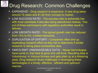 The document proposes software solutions for drug research, including text mining, data warehousing, data mining, database development, and big data analytics. It discusses common challenges in drug research like the high costs and low success rates. It then describes various solutions like text mining patents and research to help identify new research opportunities and reduce duplication of efforts. It provides examples of how various pharmaceutical companies use data mining and warehousing techniques. Overall, the document pitches different IT solutions that can help pharmaceutical and life sciences companies address their research challenges and make their processes more efficient.