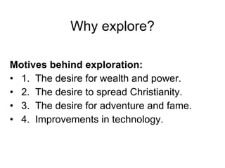 1. The document discusses the motives and methods of European colonization in North America between the 16th and 17th centuries, including the desire for wealth, spreading Christianity, and finding a Northwest Passage to Asia. 2. It examines the establishment of key colonies like Jamestown and Plymouth, which struggled at first but grew prosperous through the introduction of cash crops like tobacco. 3. It also covers the interactions between European colonists and Native Americans like the Powhatan and Pequot tribes, which often led to conflict over land and resources.