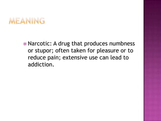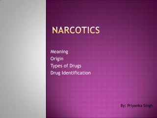 This document discusses different types of drugs including narcotics and non-narcotics. It provides details on opium, morphine, heroin, codeine, barbiturates, cocaine, amphetamines, methamphetamine, marijuana, LSD and other drugs. It explains that narcotics are derived from the Greek word meaning lethargy and includes opium-based drugs and barbiturates. Non-narcotics include LSD, amphetamines and are divided into depressants, stimulants and hallucinogens. The document also outlines the Narcotic Drugs and Psychotropic Substances Act of 1985 in India and the role of forensic laboratories in drug identification and analysis