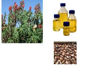The document discusses several plant-derived fixed oils, including their biological sources, methods of preparation, descriptions, chemical constituents, and uses. Arachis (peanut), castor, olive, linseed, sesame, safflower and neem oils are summarized. Arachis oil is expressed from peanut kernels and used as an edible oil, lubricant and in cosmetics and injections. Castor oil from castor seeds is used orally and in soaps, hair oils and lubricants. Olive oil from olive fruits is used topically as an emollient and in ear wax. Linseed oil from flax seeds is used in paints, varnishes and skin treatments. Sesame oil from