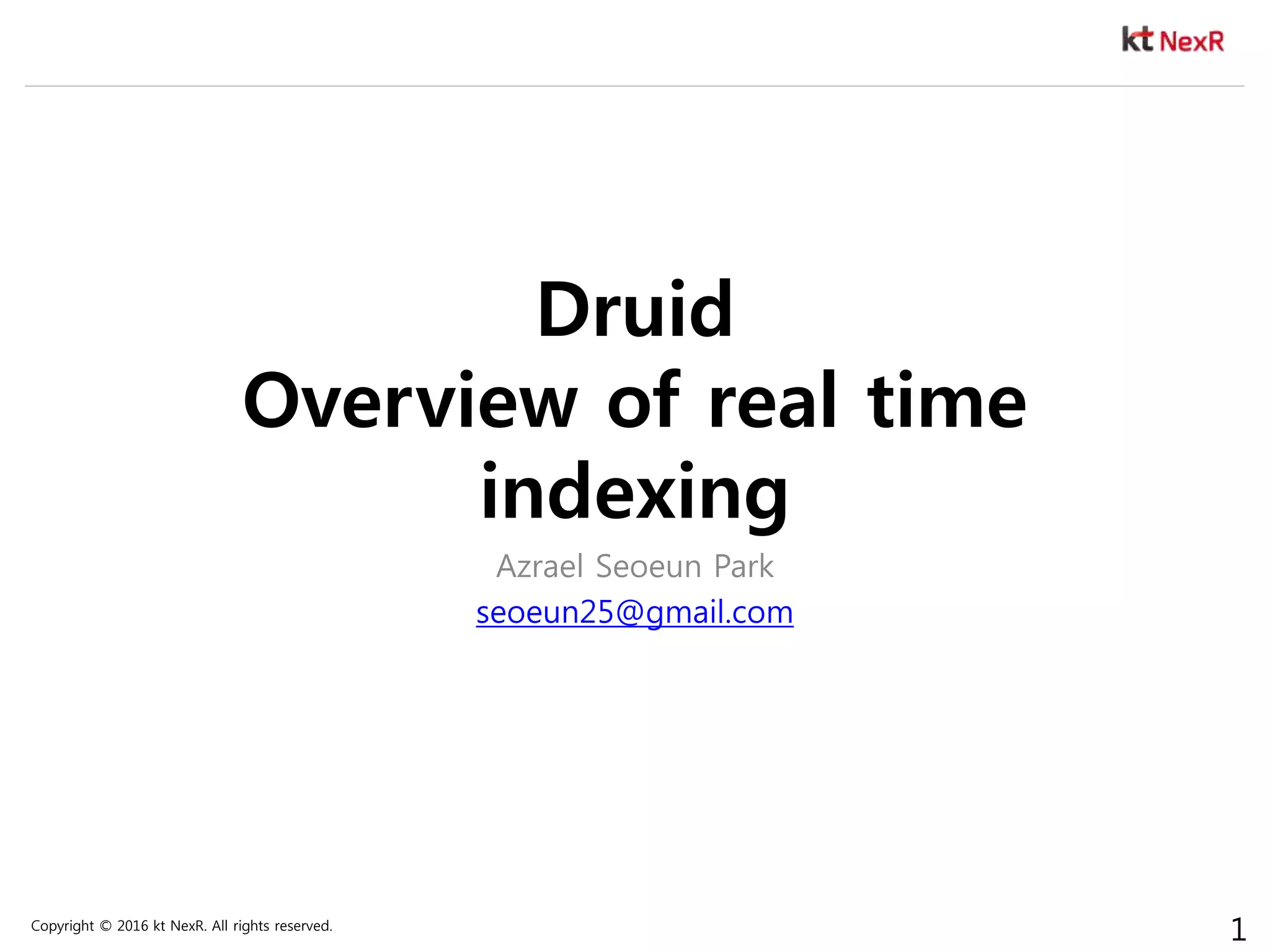 This document provides an overview of real-time indexing in Druid. It describes the key components of Druid's real-time indexing architecture including Tranquility, the indexing service, firehose, plumber and real-time tasks. Tranquility is used to ingest event streams from Kafka in real-time and submit indexing tasks to Druid. The tasks read data from the firehose, incrementally build indexes, and push completed segments to deep storage via the plumber. The document explains how these components work together to continuously ingest and index streaming data.