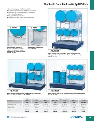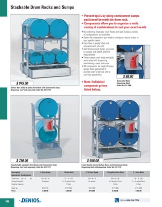The document provides detailed information on various stackable drum racks and containment sumps designed for organizing and dispensing hazardous materials, ensuring compliance with OSHA and EPA regulations. It includes specifics such as dimensions, storage capacities, and prices for individual components like dispensing shelves, metal racks, and sumps made from heavy gauge galvanized steel. The components are modular, allowing customization for specific requirements and aiding in spill containment for safe chemical storage.