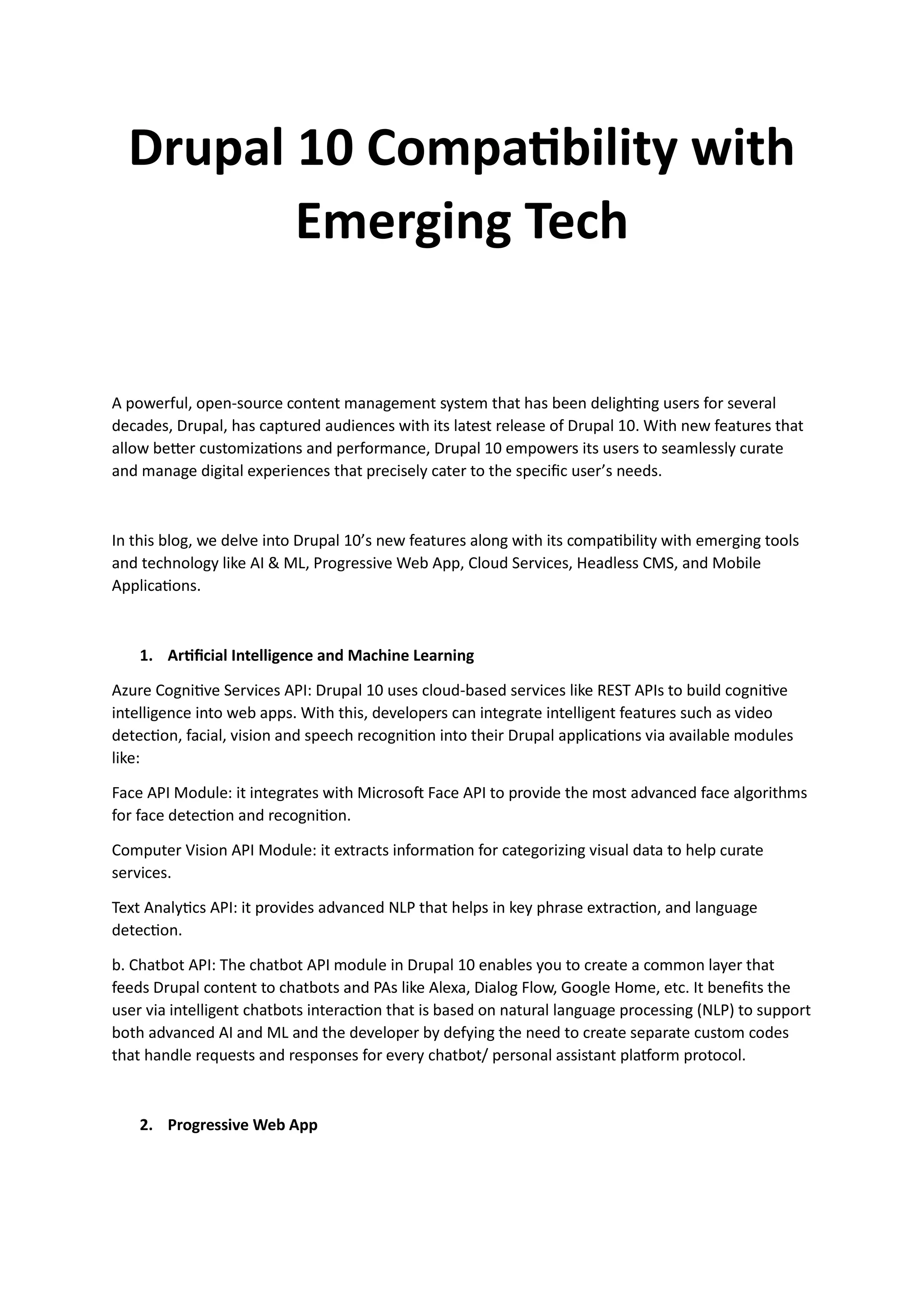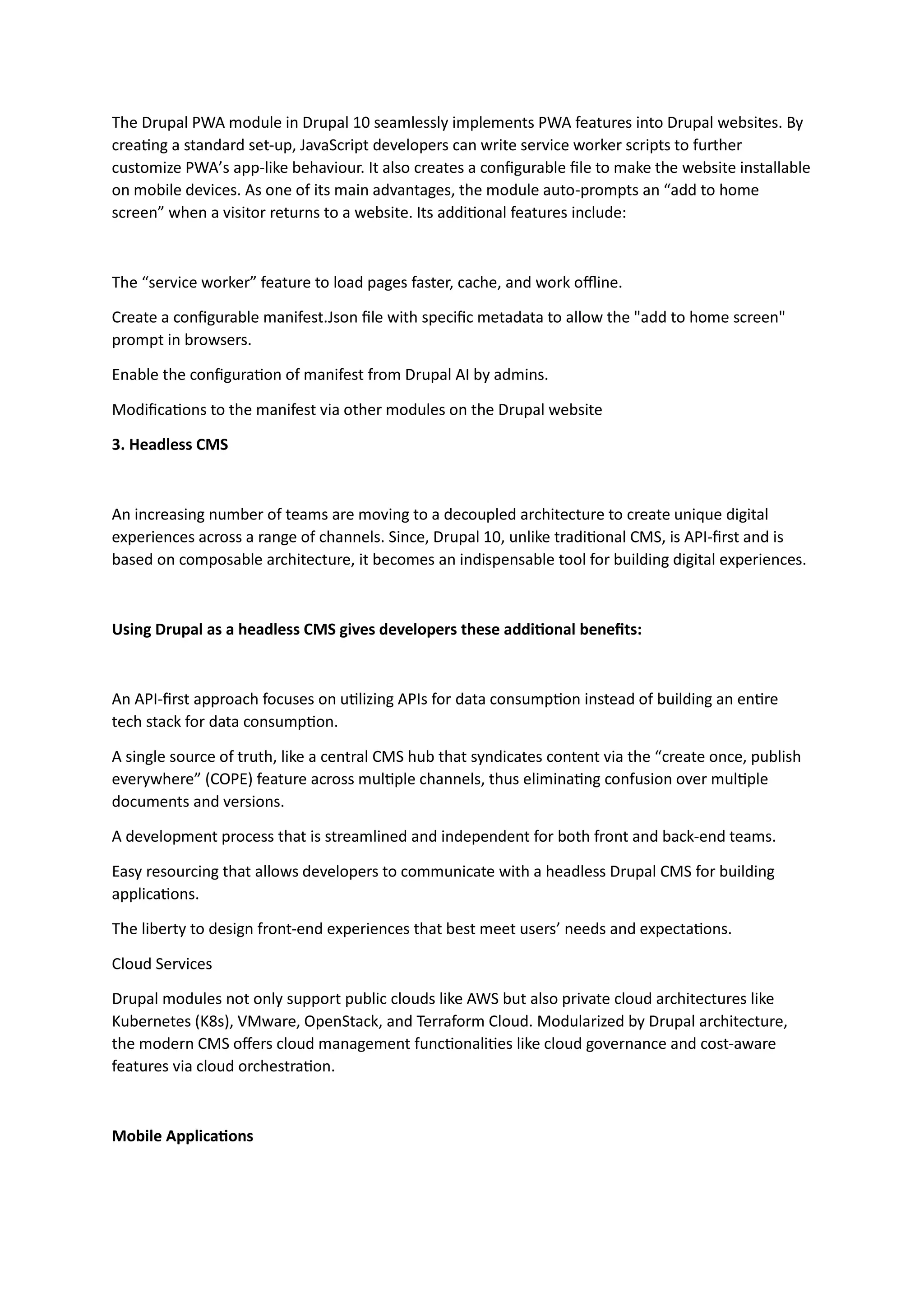 Drupal 10 is an advanced open-source content management system designed for better customization and performance, integrating emerging technologies such as AI, machine learning, and progressive web apps. It features a headless CMS architecture, suitable for API-driven development and multi-channel content syndication, alongside strong support for cloud services and mobile applications. Upgrading from older Drupal versions to Drupal 10 offers improved functionality, flexibility, and performance, making it an ideal choice for businesses seeking modern digital experiences.