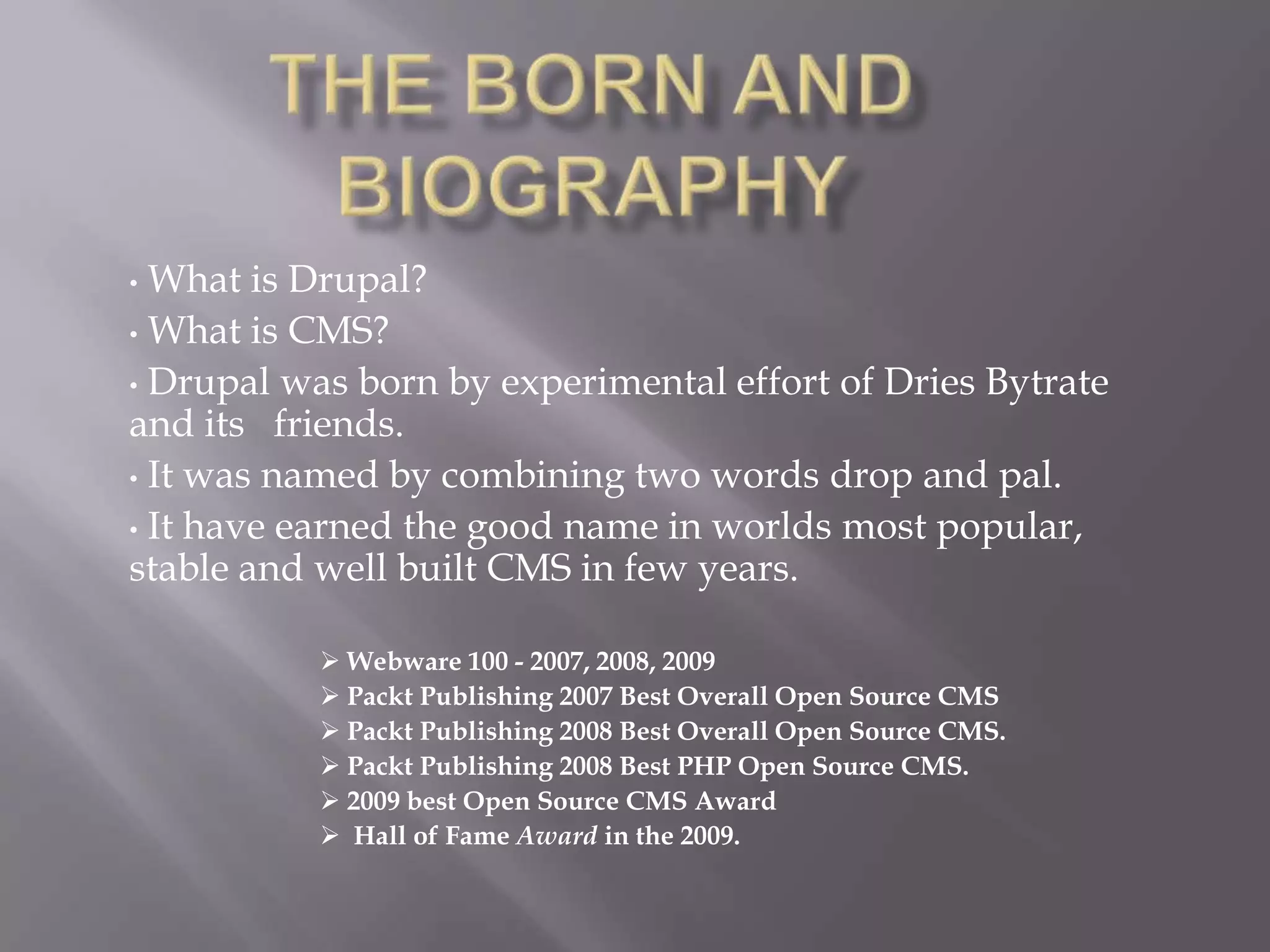 Drupal is a popular content management system (CMS) developed by Dries Buytaert and is known for its lightweight structure and extensive library of contributed modules. It supports multiple databases and operating systems, and allows for easy extension of its core functionality through modules and themes. The document also discusses key features such as its MVC structure, user permission management, and file directory structure essential for installation and customization.