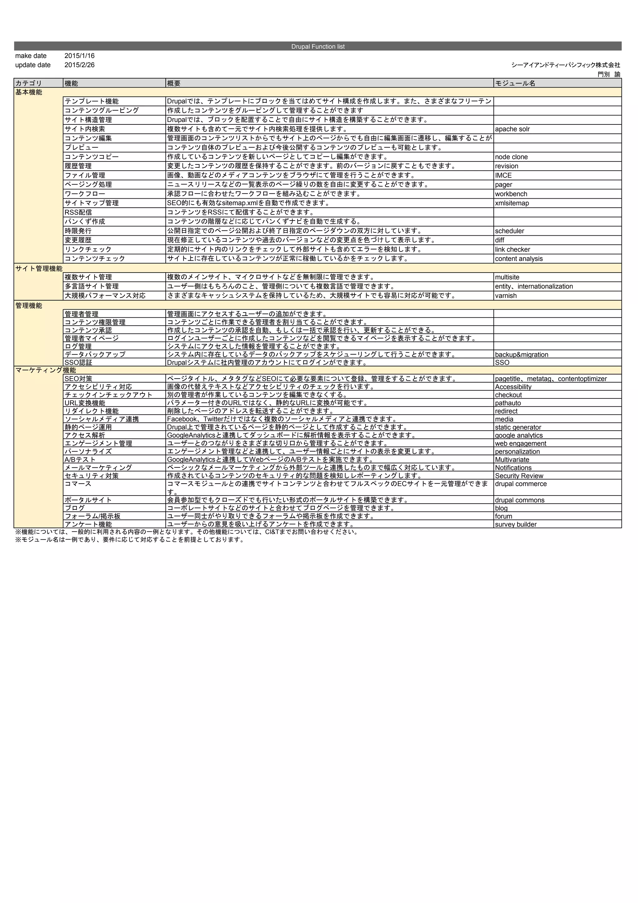 デジタルマーケティングプラットフォーム「Drupal」のメイン機能を一覧化しました。 多くのモジュールを持つDrupalをより効果的に利用するため、Drupalで利用できる機能とそれらを実現するモジュールの例を記載しました。