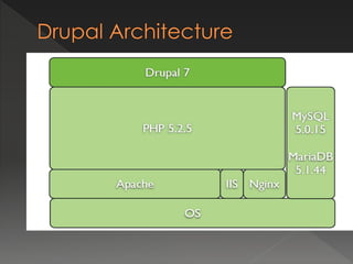 This document provides an overview of the open source content management system (CMS) Drupal. It discusses Drupal's history as a message board created in 2001, describes its basic features and architecture, lists some major websites that use Drupal, and outlines the requirements and process for installing Drupal.