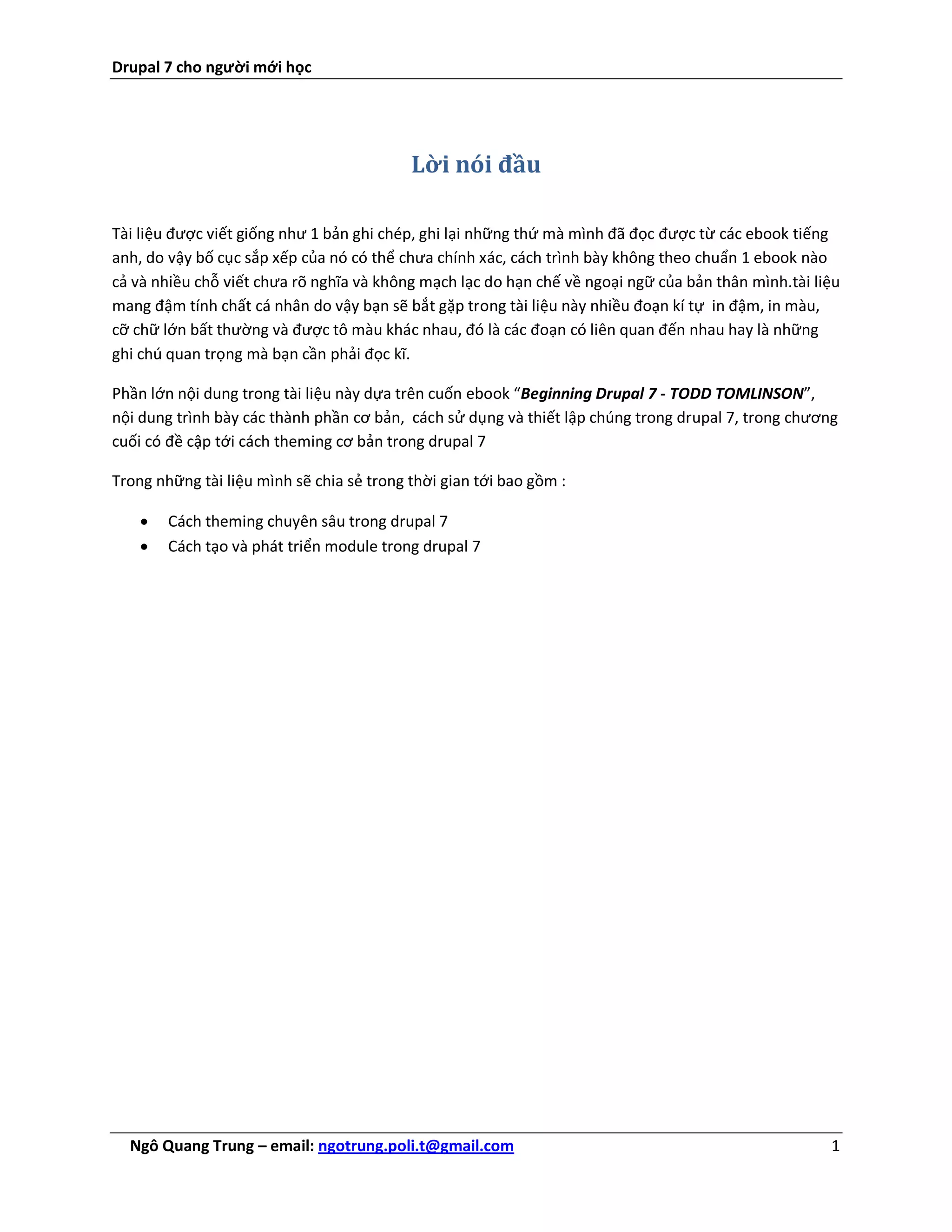 Tài liệu 'Drupal 7 cho người mới học' là một ghi chép cá nhân về cách sử dụng và thiết lập Drupal 7, dựa trên cuốn ebook 'Beginning Drupal 7' của Todd Tomlinson. Nó bao gồm các phần như tạo nội dung, quản lý người dùng, và cấu hình giao diện, với nhiều chú thích và định dạng đặc biệt để nhấn mạnh thông tin quan trọng. Tài liệu cũng đề cập đến các khía cạnh nâng cao như theming và phát triển module trong tương lai.