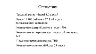 Документ представляет собой руководство по Drupal 8, включая ключевые изменения и особенности системы, такие как новые типы полей, поддержка многозначности и модуль миграции. Упоминается интеграция компонентов Symfony2, переход на объектно-ориентированное программирование и улучшенная конфигурационная система. Также перечислены важные моменты разработки, фазы и планы по будущим релизам, а также ресурсы для изучения.