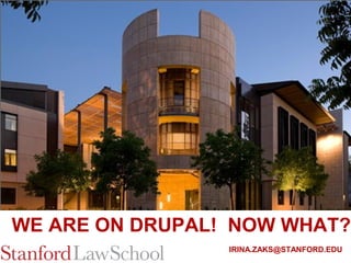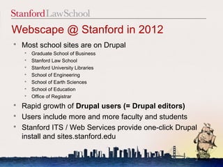 This document discusses Stanford's growing use of Drupal for websites. It notes that most Stanford schools now use Drupal, including the law school. It then discusses the law school's implementation of Drupal, including migrating their main website to Drupal in 2012. It also discusses ongoing maintenance, development needs, and improvements to the user experience since the launch.