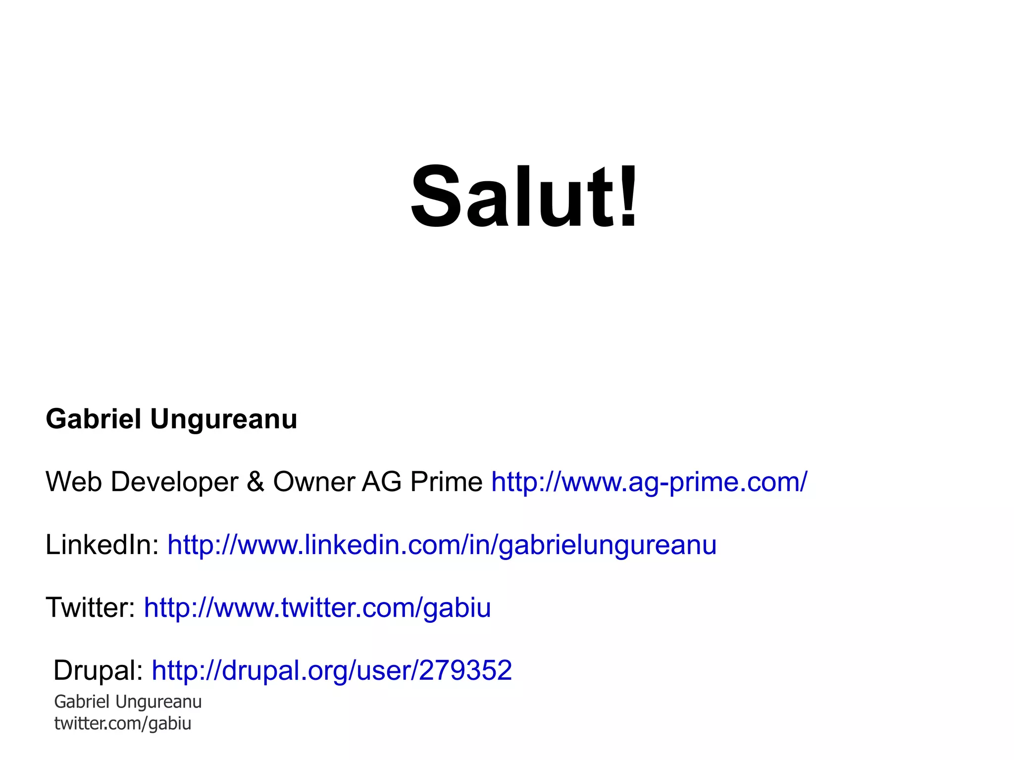 Gabriel Ungureanu, dezvoltator web cu 4 ani de experiență, discută despre utilizarea Drupal, menționând avantajele și dezavantajele acestei platforme. El subliniază importanța comunității, varietatea de module disponibile și abordările programării orientate pe obiect (POO) utilizate în Drupal. Documentul oferă detalii tehnice despre modul de dezvoltare a modulelor, temelor și structura acestora.