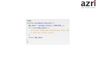Gokul N K has worked on Drupal caching and discusses why performance is important for reducing page load times and increasing conversions. Drupal uses a database heavily and caching is needed to improve speed. Some techniques discussed are page caching, block caching, aggregate files, disabling unneeded modules, views caching, reducing 404 errors, and database profiling. Memcached, reverse proxies, CDNs, and load balancers can also help with caching. Cache invalidation and naming things are two hard problems in computer science.