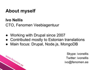 Ivo Nellis, CTO of Fenomen Veebiagentuur, has been working with Drupal since 2007 and focuses on developing real-time applications using Node.js and MongoDB. He highlights the strengths of Node.js, including its speed, asynchronous nature, and the ability to facilitate real-time communication through WebSockets. The document also discusses the integration of Node.js with Drupal for scalable applications, emphasizing the use of existing libraries and the benefits of the Node.js module for real-time communication.