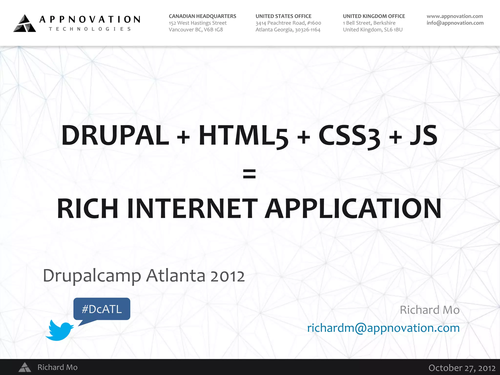 Richard Mo presented on how to build rich internet applications (RIAs) by combining Drupal, HTML5, CSS3, JavaScript, and Sproutcore. He explained that traditional website design is inadequate for building fully-featured applications that work across devices. His solution is a hybrid design with Drupal as the backend content management system, and HTML5, CSS3 and JavaScript with Sproutcore for the highly interactive frontend user interface. This allows building applications that behave like native desktop or mobile apps while keeping content centralized in Drupal.