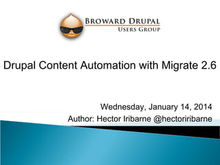 The document is a guide on using the Migrate module for content automation in Drupal 7, detailing the installation process and configuration of the necessary modules. It includes steps for setting up a clean Drupal environment, importing content from CSV files, and executing migrations. Additional resources and code walkthroughs are provided for further assistance.