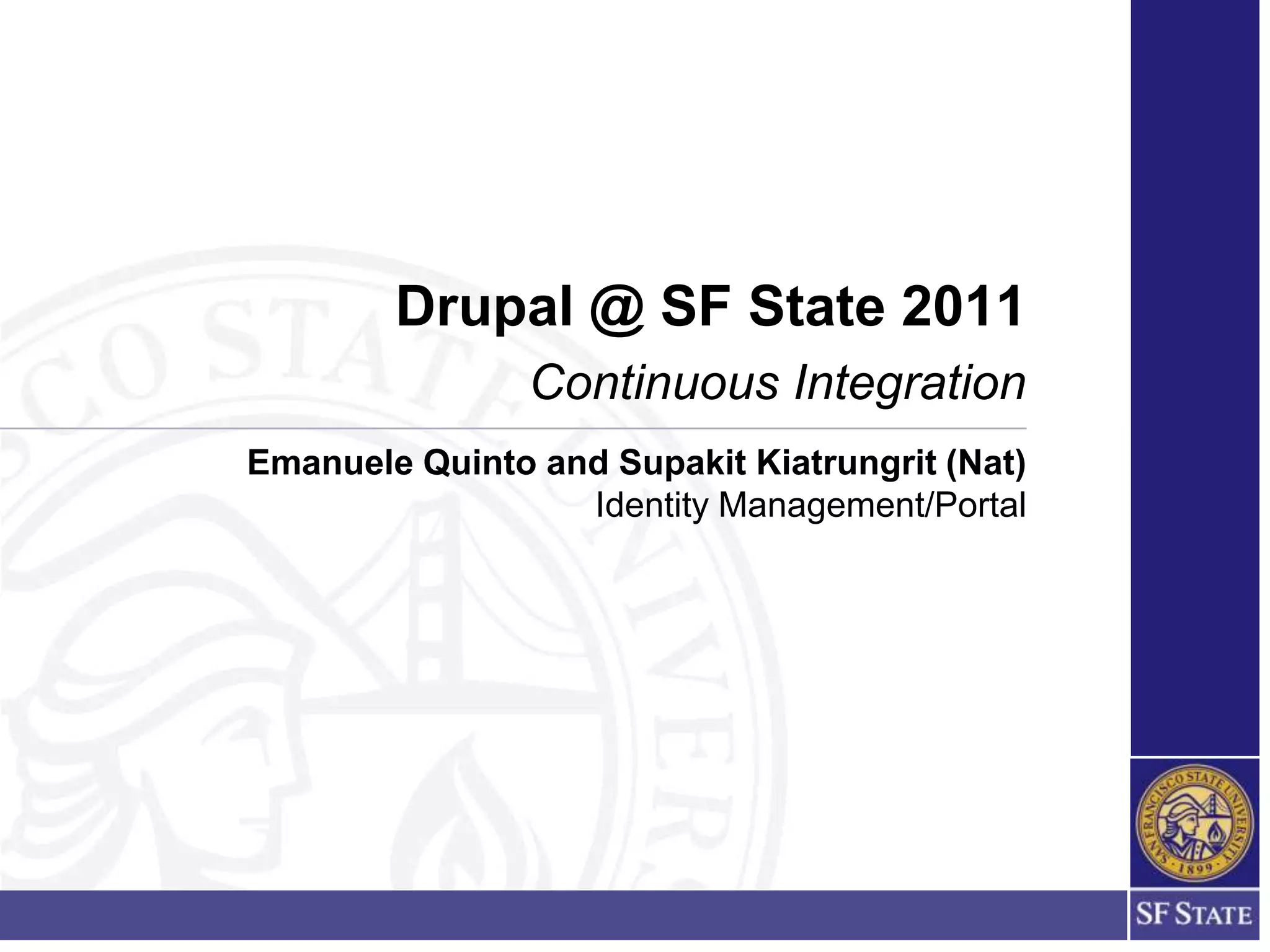 The document discusses continuous integration (CI) within the context of Drupal at San Francisco State University, detailing tools and technologies like Drush and Phing used for automated build processes and deployments. It emphasizes the importance of frequent integration and automated testing to enhance software quality and reduce delivery time. Additionally, it outlines the roles of different CI tools, such as Quickbuild, Apache Ant, and their functionalities in the development cycle.
