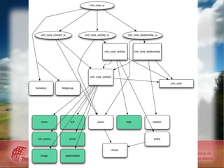 Документ описывает функции и преимущества систем управления взаимоотношениями с клиентами (CRM), включая автоматизацию продаж, маркетинг и анализ данных. Приводится информация о таких системах, как Drupal CRM Core, и их возможностях, включая интеграцию, управление контактами и массовые операции. Также упоминаются существующие CRM-системы и модульный подход к их расширению.