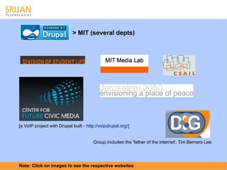 This document discusses how several prominent organizations such as MIT, Harvard, the White House, and The Economist use Drupal. It provides examples of how these organizations built websites, communities, and tools using Drupal. It also outlines the benefits of using Drupal, such as flexibility, robustness, and integration with other systems. Finally, it discusses potential use cases for an educational institution to implement Drupal.