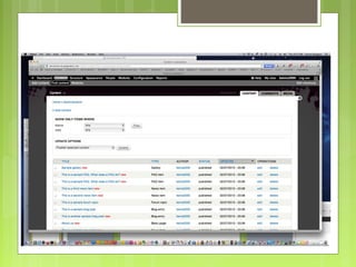 The document provides a step-by-step guide for creating a site on Drupal Gardens, emphasizing the importance of confirming registration via email to avoid site deletion. It outlines the use of templates, administrative configurations, and the process of adding and promoting content to the front page. Key functionalities, such as the administrative overlay and shortcut bar customization, are also highlighted.