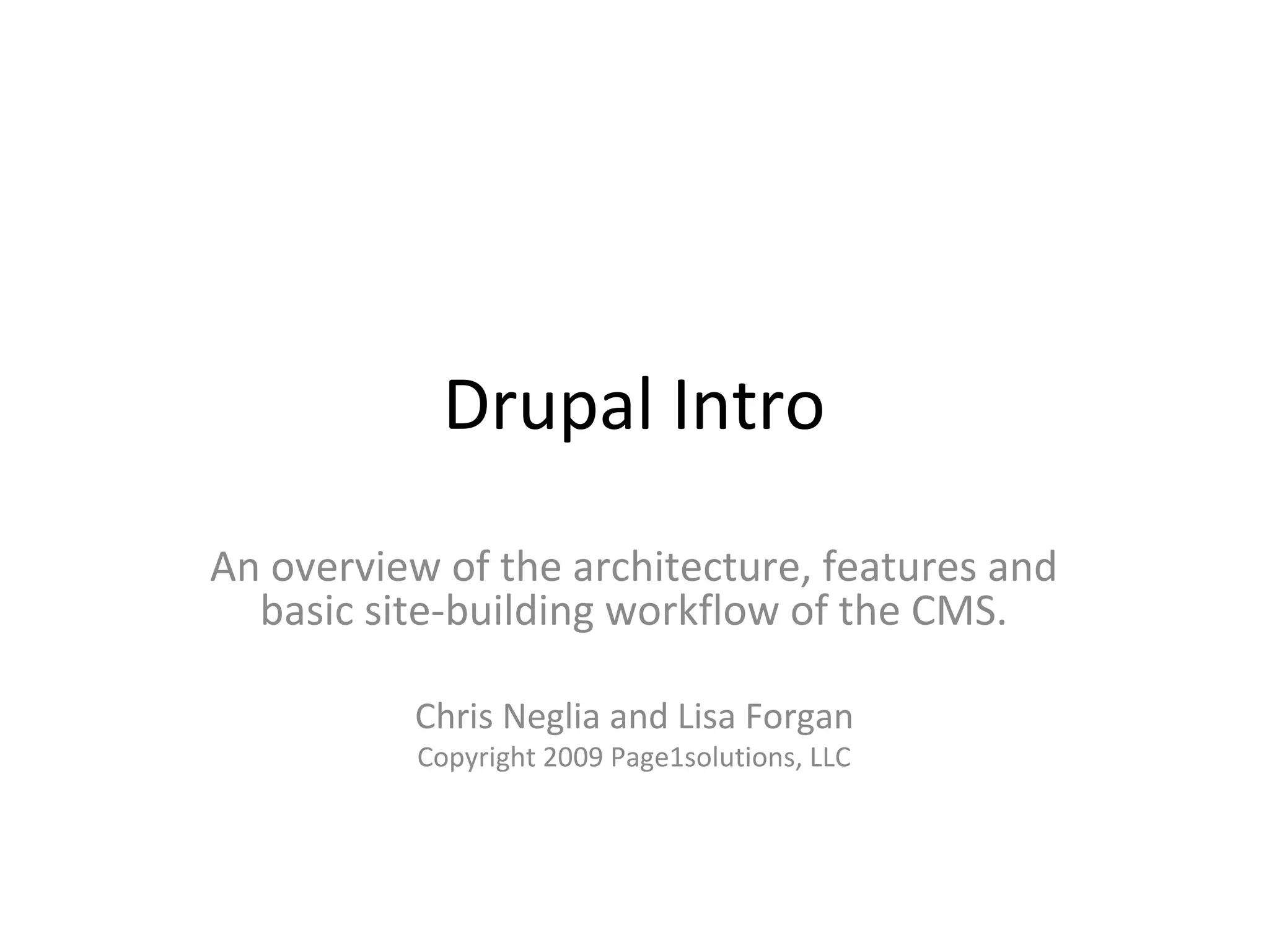 Drupal is an open source content management system (CMS) written in PHP. It allows users to build and manage websites through a user interface without having to manually code and edit HTML files. Drupal has a modular architecture that can be extended through modules and themes to add functionality and customize appearance. It uses a database to store content, users, and site configurations. Content in Drupal is primarily managed through nodes, which are content objects that can be customized into different content types like pages or blog posts. Drupal provides role-based access control and permissions to manage user access. Popular modules extend its functionality for features like user management, content types, menus, views, and more.