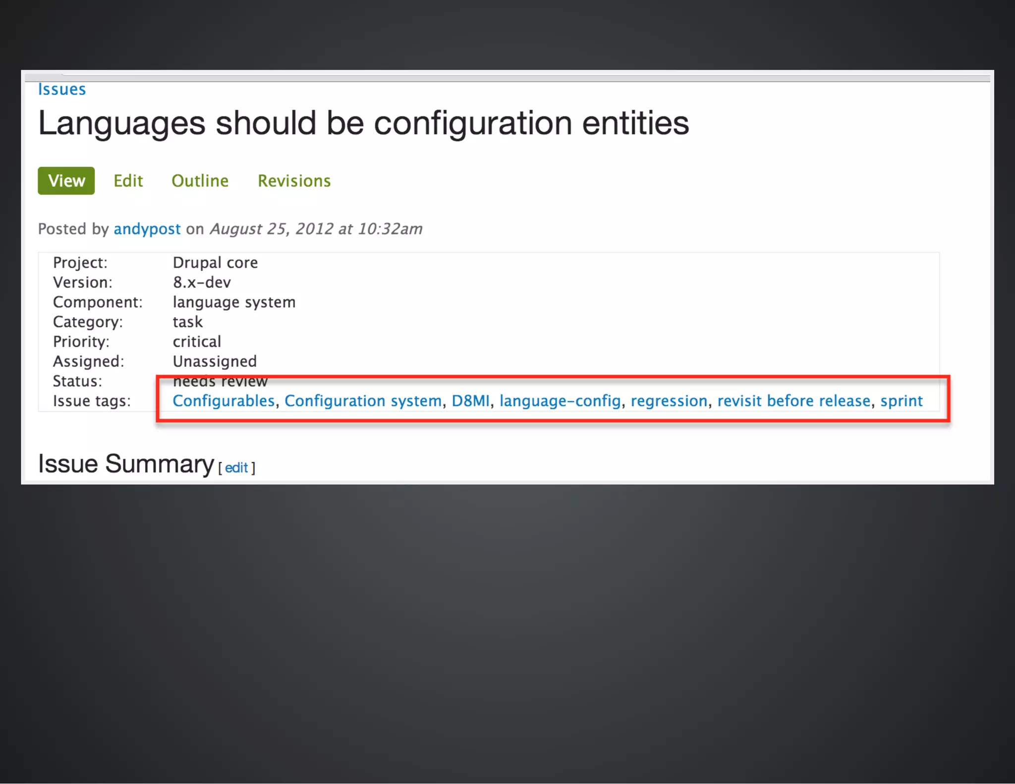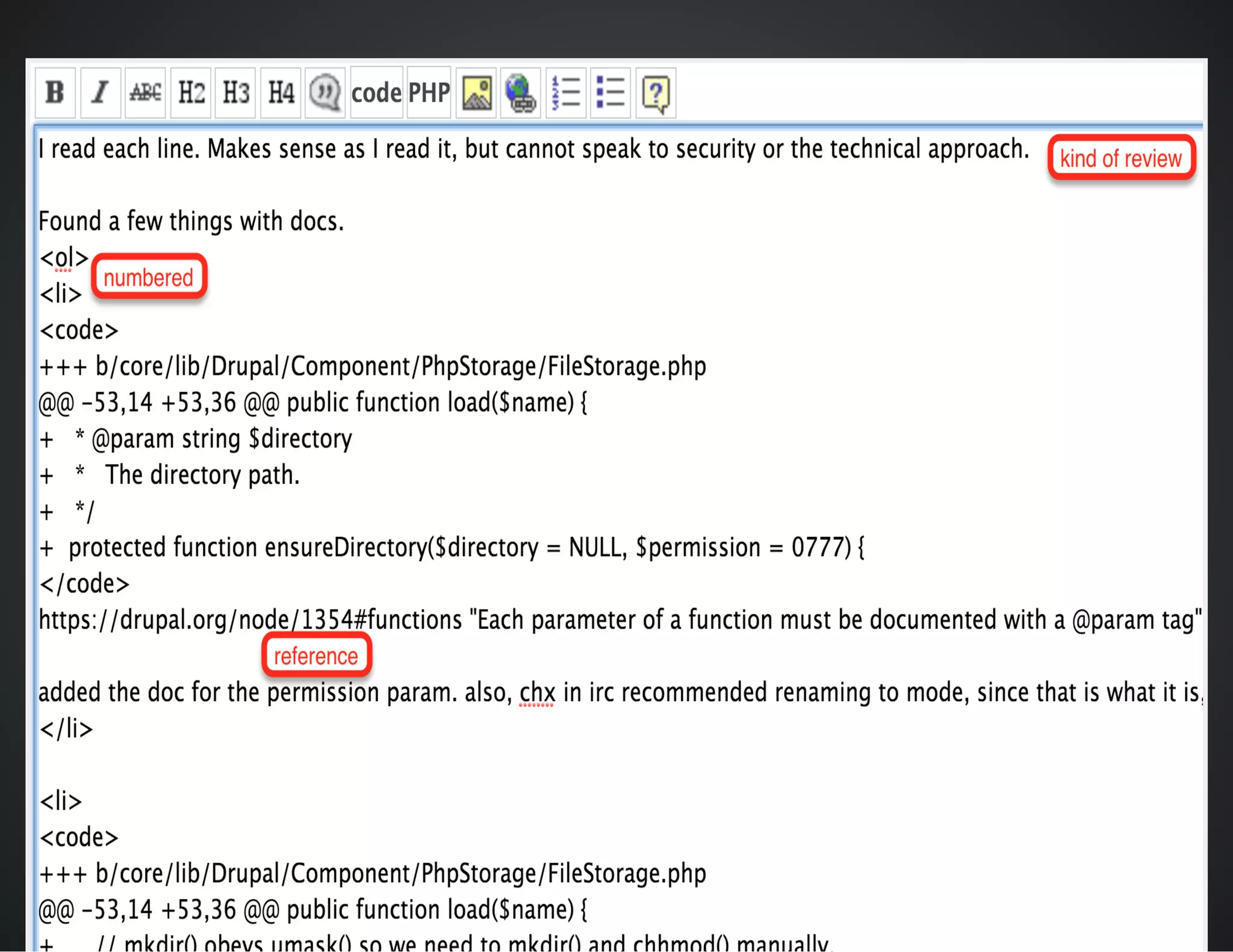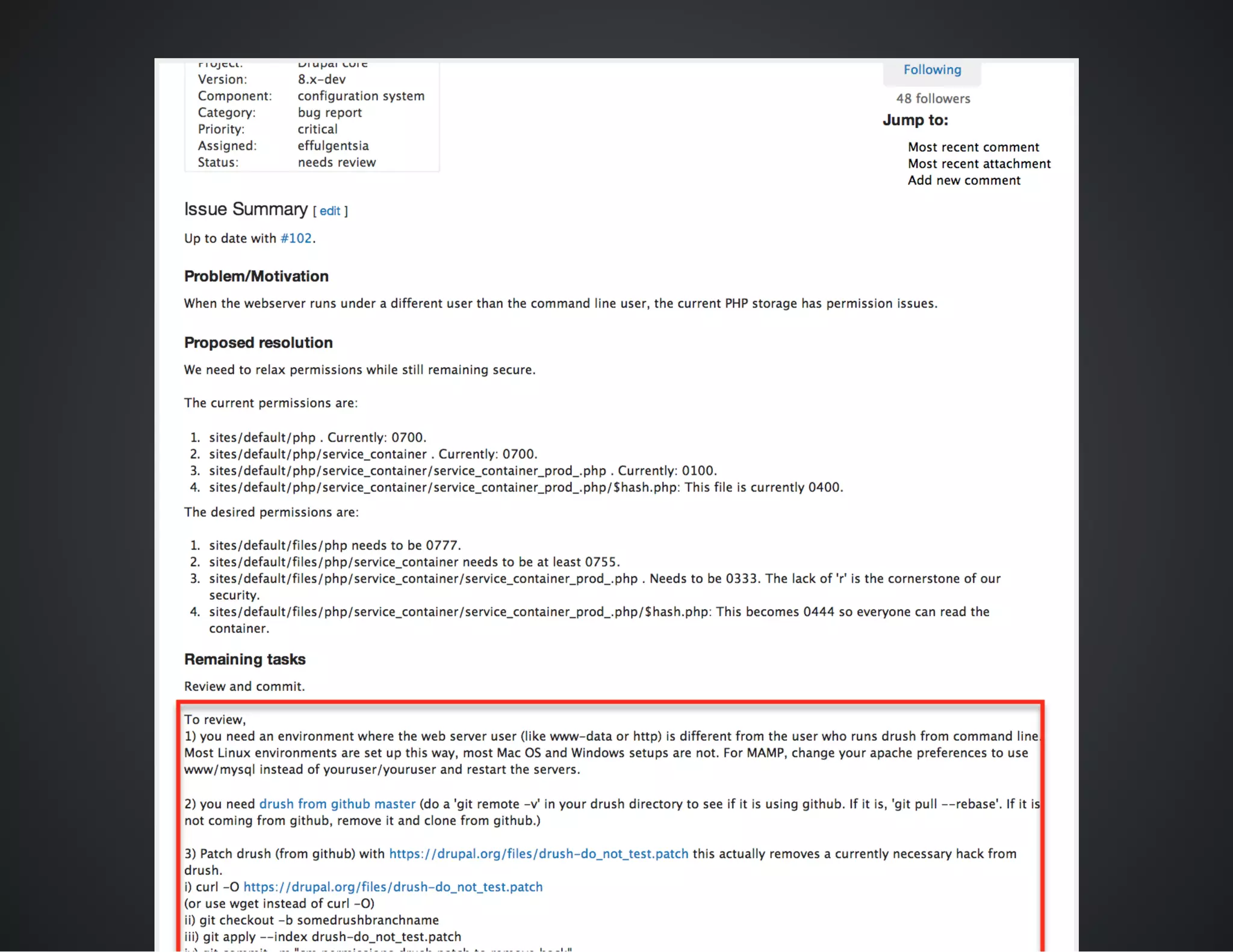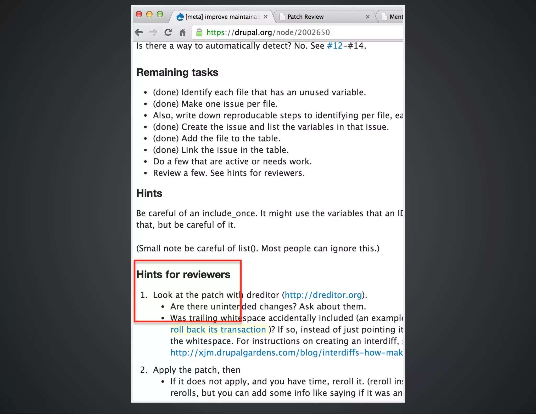 The document outlines best practices for conducting patch reviews in the Drupal community, emphasizing the importance of specificity in review tags and the need for detailed issue summaries. It provides resources and links for contributors to improve their review process, including accessibility and usability reviews, as well as guidelines for writing clear documentation. Additionally, it encourages mentorship and continuous improvement in reviewing and contributing to Drupal's core initiatives.