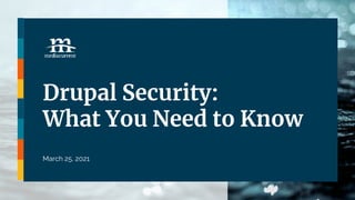 This document discusses Drupal security best practices. It begins with introducing Mediacurrent and its vision to empower people with open source technology. It then provides an agenda on Drupal security covering Security-First planning, the Drupal security team and resources, common vulnerabilities, and Drupal best practices such as module selection, patching, and API usage. The document emphasizes automating security processes, monitoring advisories, and cultivating a security-focused culture.