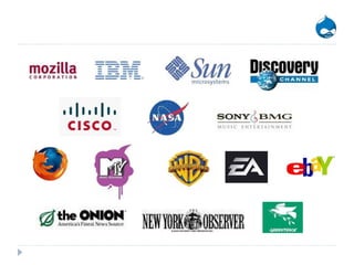 This document provides an overview and introduction to the Drupal content management system (CMS). [1] Drupal is an open source CMS that allows users to easily manage and publish web content. [2] It provides features for content authoring, page management, user access control, and more through its modular architecture and extensibility. [3] The document outlines Drupal's key capabilities and benefits, and how to install and get started with the CMS.