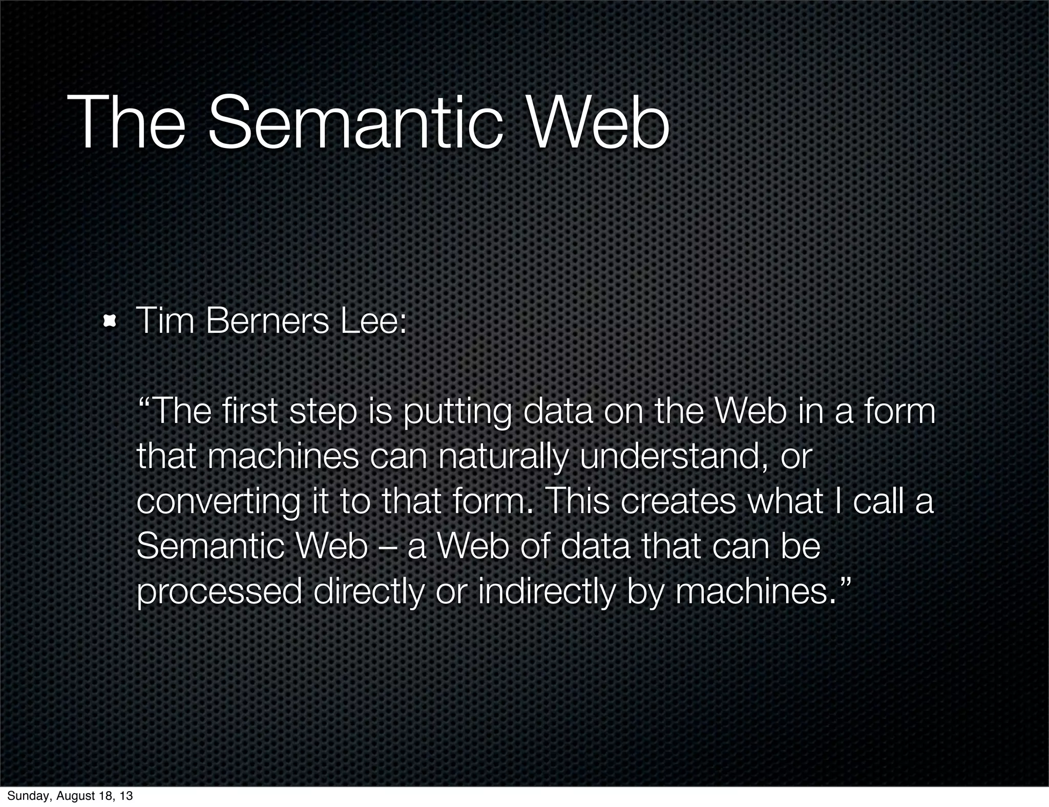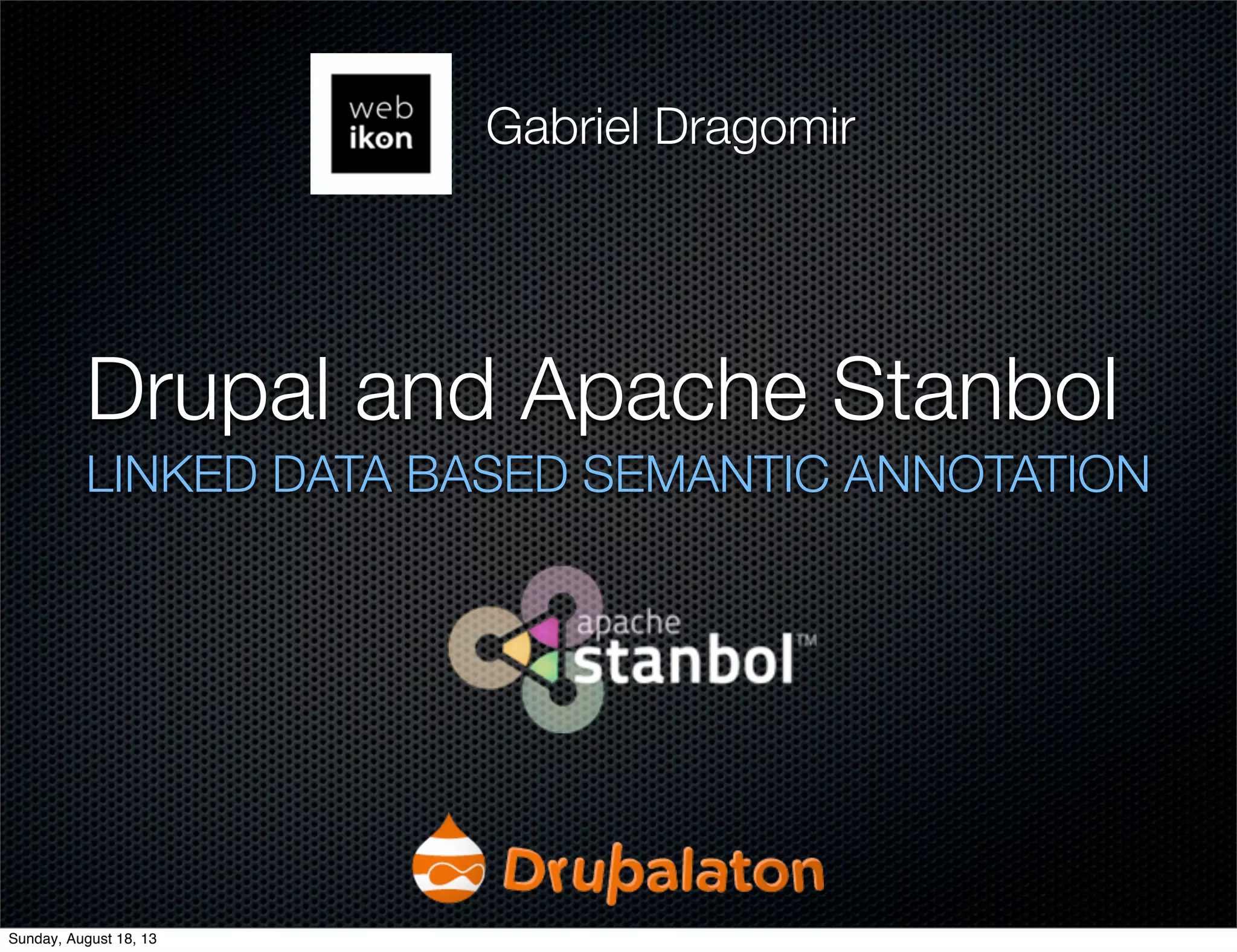 The document discusses the integration of Apache Stanbol with Drupal for semantic annotation and linked data management, emphasizing the importance of organizing and analyzing large volumes of unstructured data. It highlights the capabilities of Stanbol, including its modular architecture and service-oriented integration, enabling processes such as metadata extraction and entity recognition. The document also outlines the practical use of Stanbol within Drupal, showcasing how to use RDF for data transport and semantic enrichment of content.