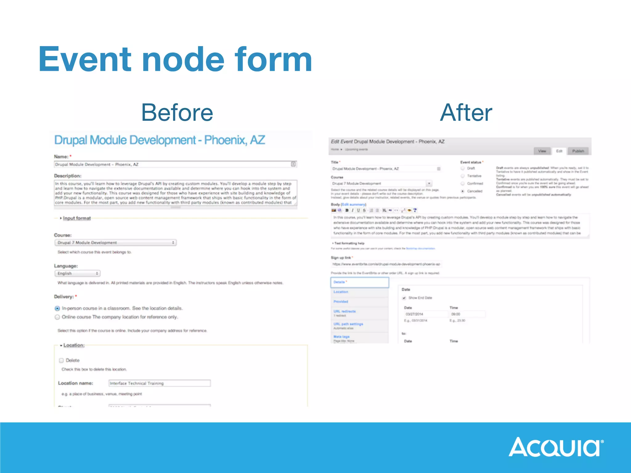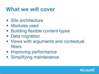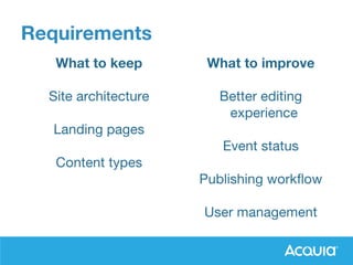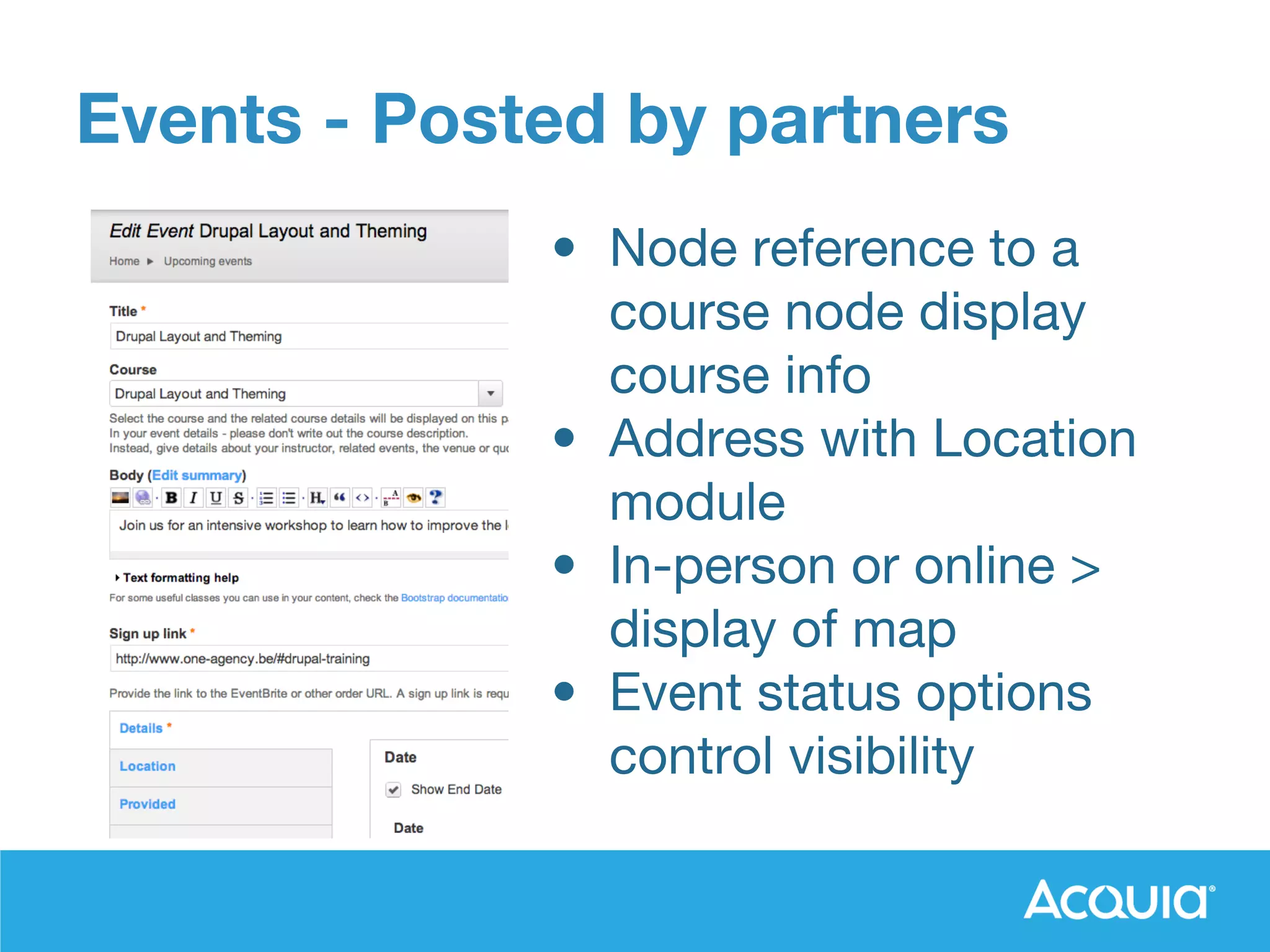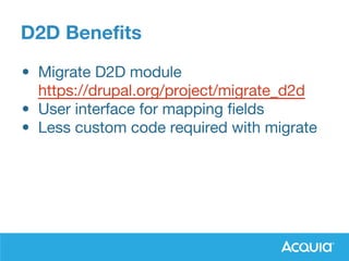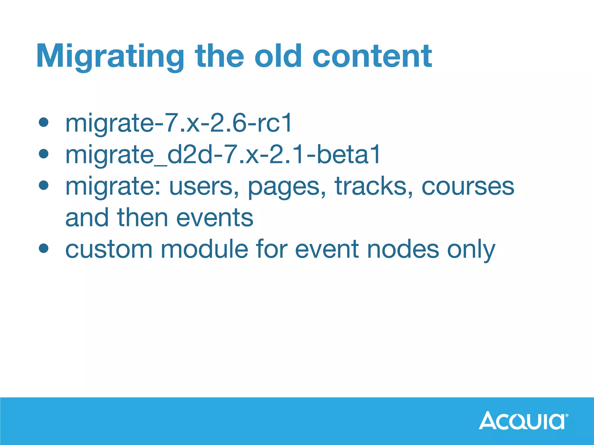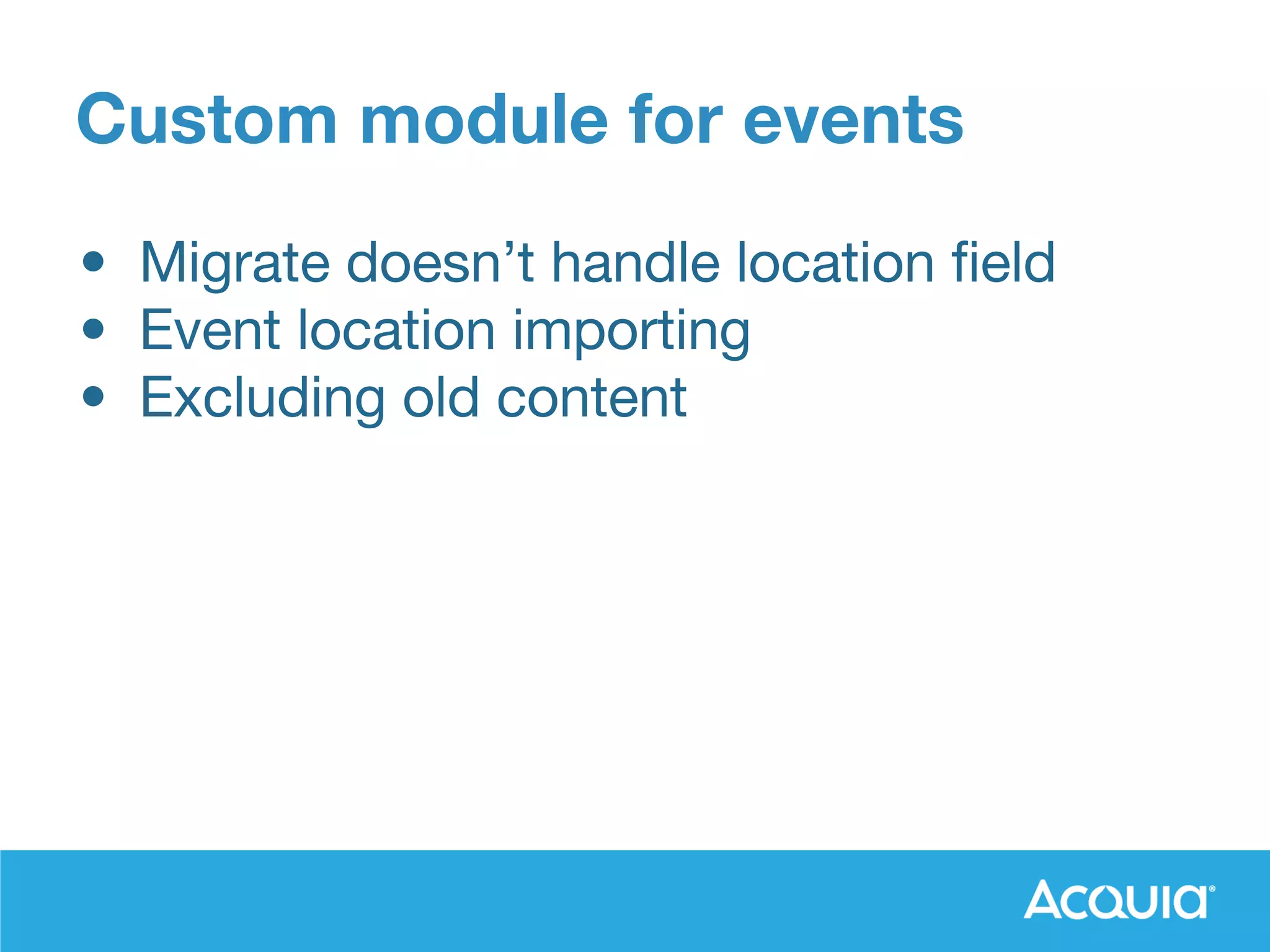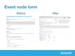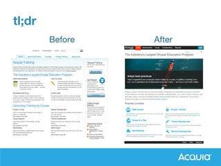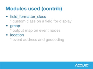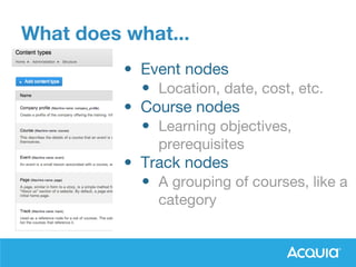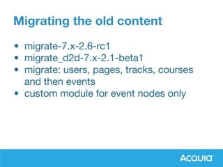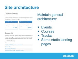 This document provides code snippets for building a training site in Drupal. It shows how to style buttons using preprocess_field and construct a migration class to pull in location data from additional tables for the training nodes. The migration class overrides the query and prepareRow methods to join the location tables and filter out past events.