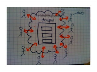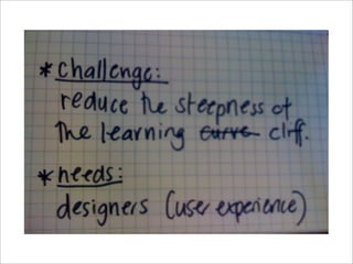 Leisa Reichelt and Mark Boulton presented their work on D7UX, an initiative to redesign the Drupal administrative interface. They conducted user research including interviews and usability testing to define user audiences like content creators and web savvy non-developers. Their redesign goals were to simplify the interface, improve the information architecture, focus on the 80% use case, and make the interface more friendly and understandable without removing important context. They previewed some of their proposed changes like role-based shortcuts and improved editing workflows, and discussed challenges of implementing the redesign within resource constraints.