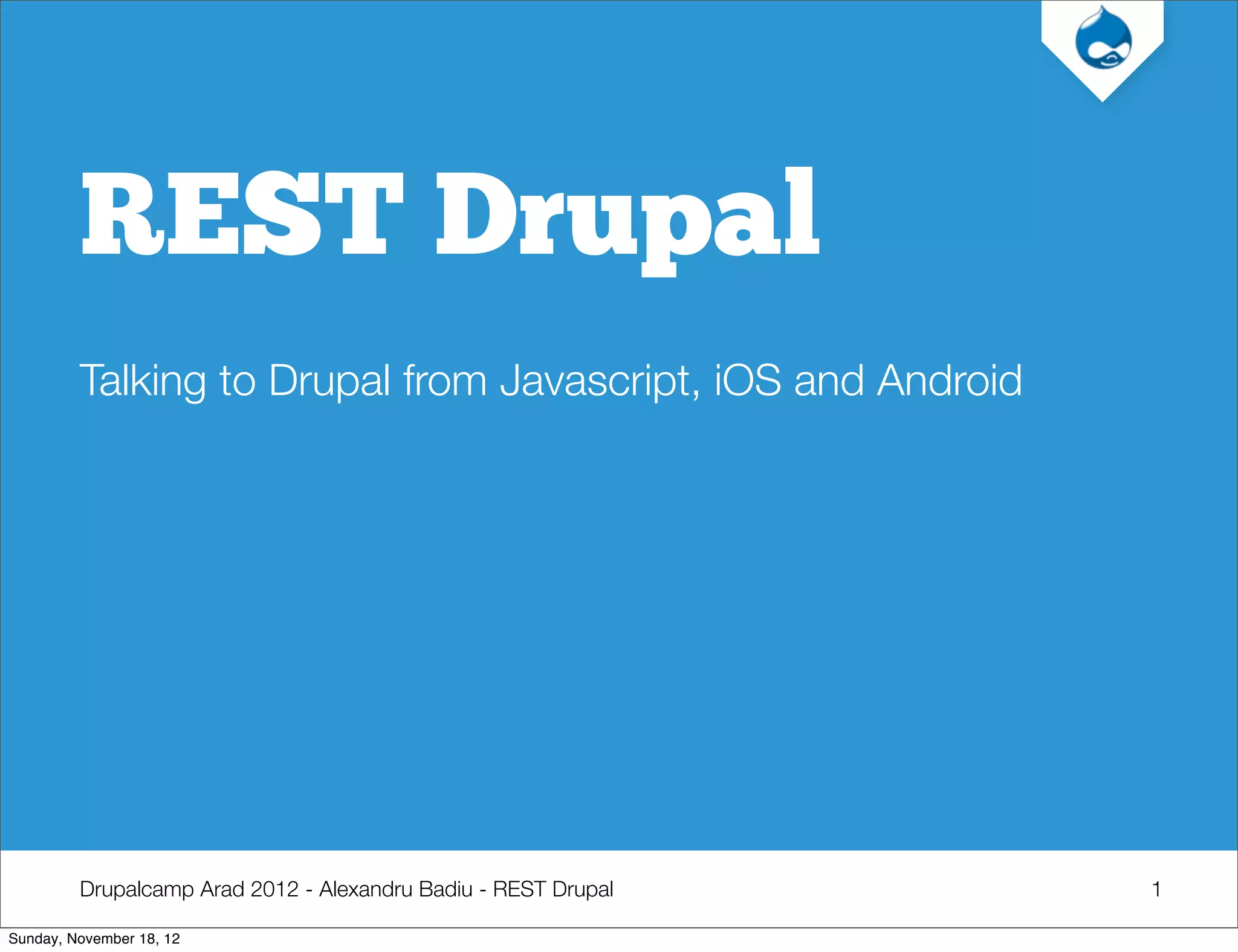 The document is a presentation by Alexandru Badiu discussing the use of RESTful services with Drupal, particularly in mobile application development for iOS and Android. It highlights the evolution and advantages of using REST over traditional services, emphasizing the speed and efficiency of using JSON. The presentation also details specific implementations and code examples related to creating mobile applications that interact with Drupal through REST APIs.