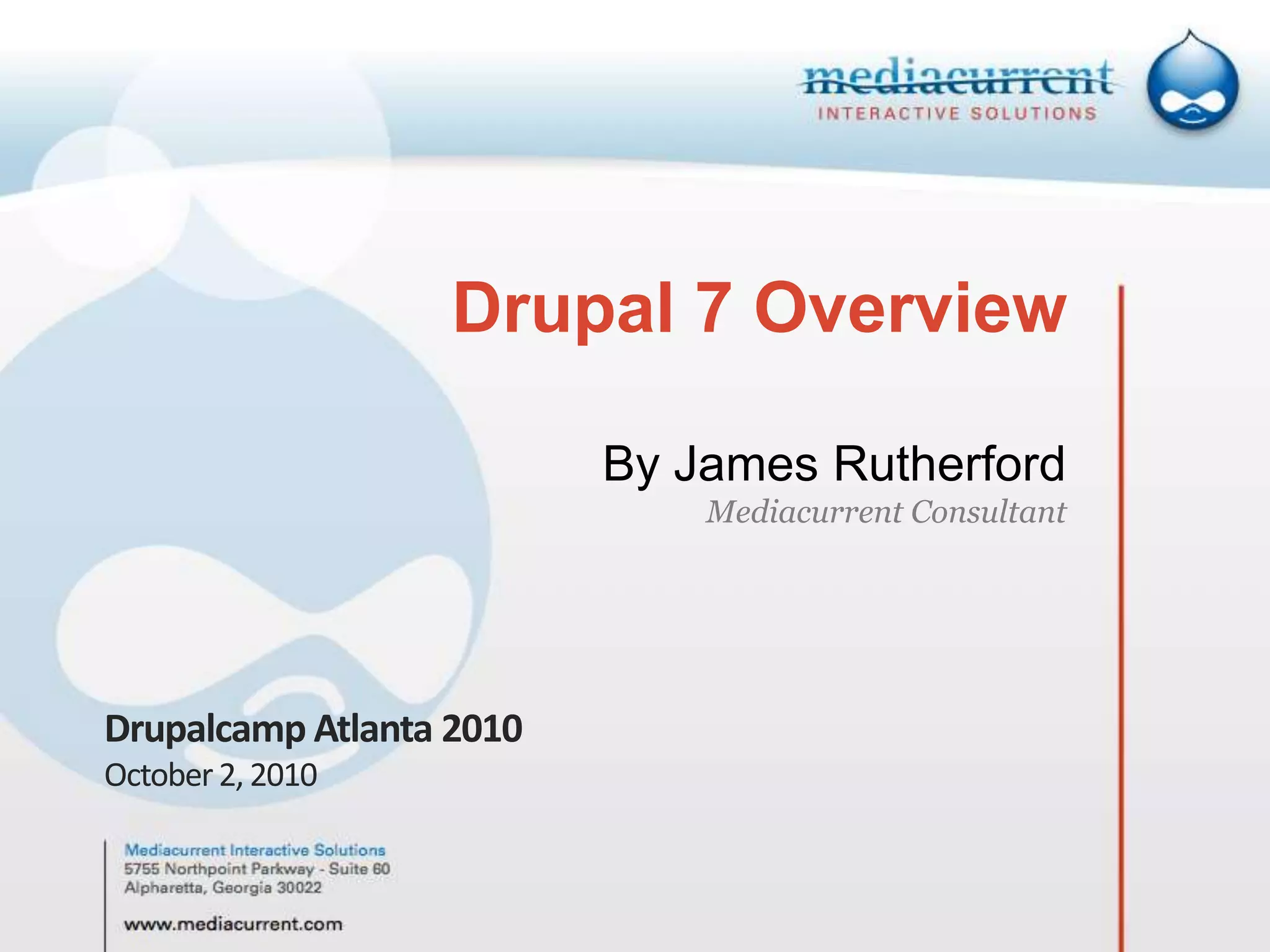 The document provides an overview of Drupal 7 by James Rutherford at Drupalcamp Atlanta in 2010. It discusses the timeline for Drupal 7's release, the major new features including a UI overhaul with new themes and admin interface, improved functionality through the new Fields API, and under the hood changes for better scalability, theming, and testing. The presentation highlights that Drupal 7 includes over 70 new contributed modules, a redesigned user experience, and improvements to make building sites and content easier.