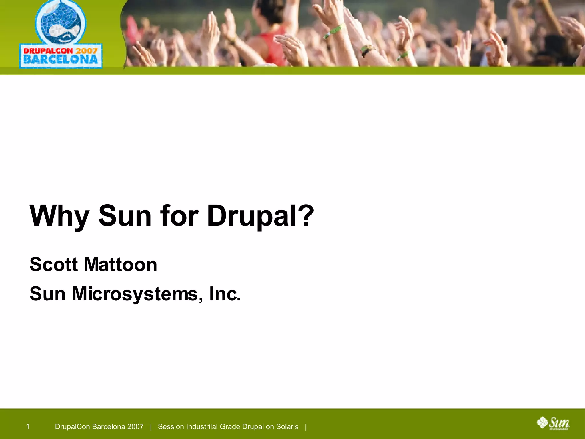 The document outlines the benefits of using Sun's technologies in conjunction with Drupal, emphasizing the collaborative and innovative approach of the Open Architecture Network (OAN). It highlights the efficiency, security, and virtualization capabilities of Solaris, including its integration with Apache and MySQL for enhanced performance and resource management. Additionally, it discusses the community achievements and the role of various technologies in optimizing Drupal applications.