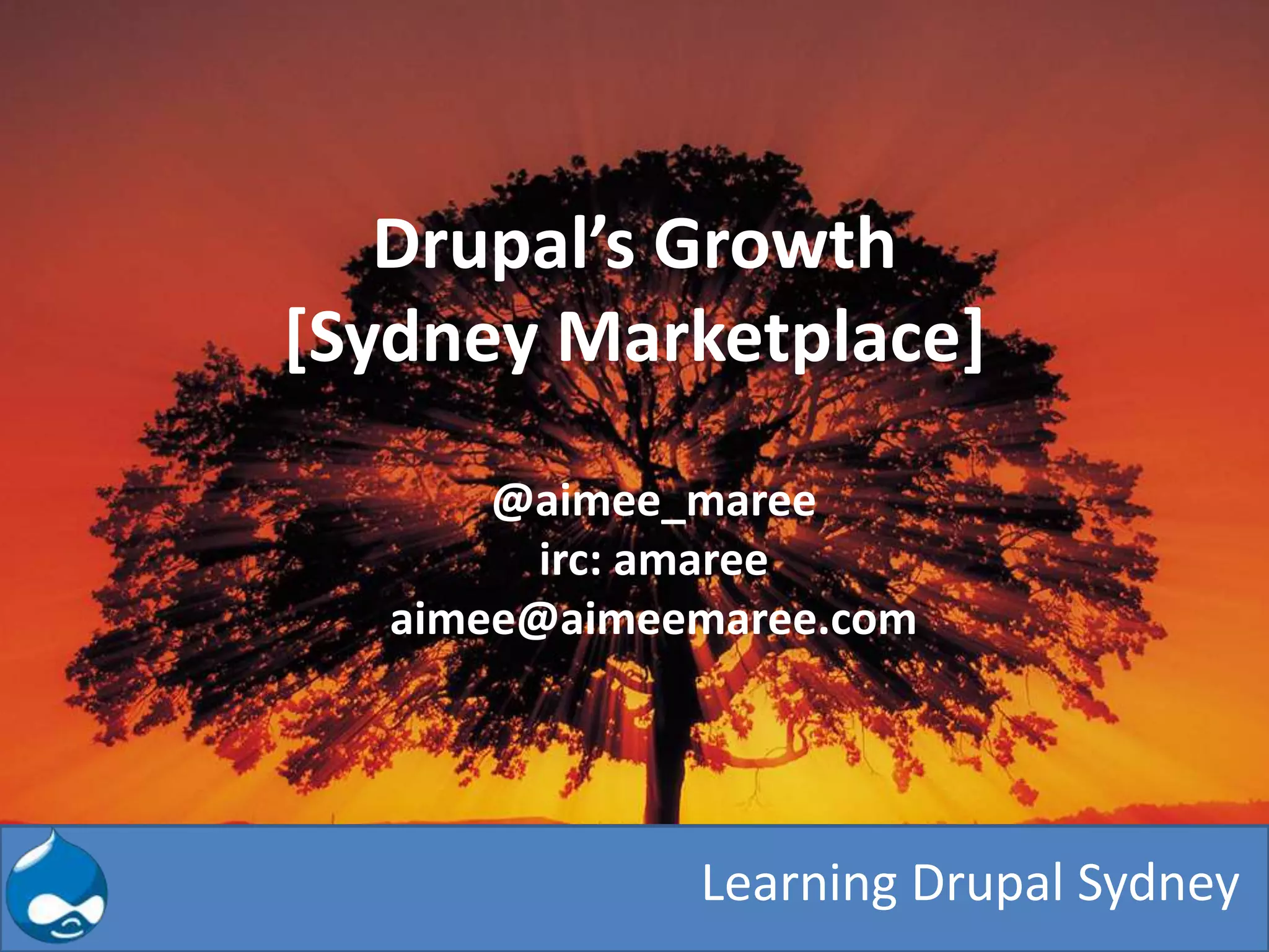 Drupal has experienced significant growth in Australia from 2008-2012. In 2008, there were few Drupal jobs and meetups were small. By 2012, there were over 100 Drupal jobs in Australia and large companies had adopted Drupal. Drupal conferences and training also grew substantially during this period. This growth occurred even as the overall economy slowed, indicating increasing demand for Drupal skills.