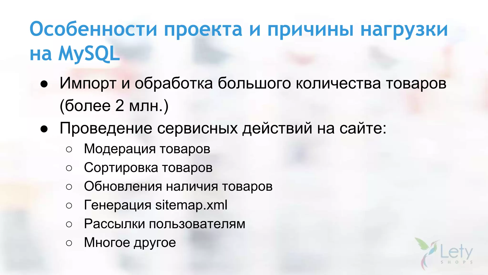 Документ описывает проблемы и решения, связанные с нагрузкой на MySQL в проекте, управляющем более 2 миллионов товаров. Основные меры включают разбиение ресурсоемких процессов на параллельные потоки и разделение сервиса на несколько серверов. Эти изменения привели к улучшению производительности и снижению нагрузки на сервер.