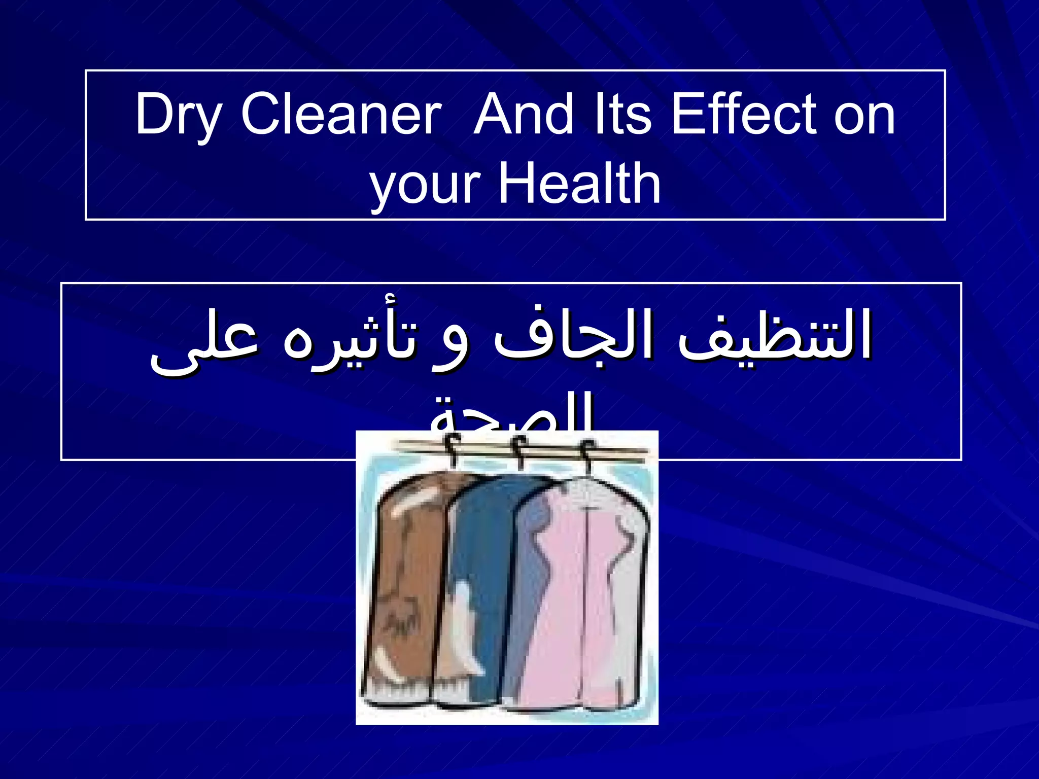 تنظيف الملابس بالطرق الجافة قد يتسبب في مخاطر صحية جسيمة، نتيجة استخدام مادة بيركلوروإيثيلين (perc) التي تؤثر سلباً على الجهاز العصبي والكبد والكلى. التعرض لهذه المادة يمكن أن يؤدي إلى آثار صحية خطيرة مثل السرطان وإصابات جلدية وإضطرابات في الذاكرة. يُنصح بتجنب القرب من الملابس المنظفة حديثًا وتهوية الملابس قبل استخدامها.