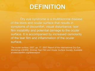 Dry eye syndrome is a multifactorial condition characterized by discomfort, visual disturbances, and potential damage to the ocular surface due to tear film instability and inflammation. Risk factors include older age, certain medications, hormonal changes, and environmental conditions. Diagnosis involves various tests such as tear film break-up time and Schirmer’s test, with treatment options ranging from environmental modifications to medical and surgical interventions.