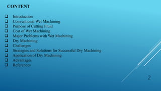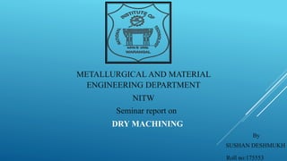 This seminar report discusses dry machining as an alternative to conventional wet machining. Wet machining utilizes cutting fluids that generate waste and pollution. Dry machining aims to eliminate cutting fluids. However, dry machining is challenging due to high temperatures that reduce tool life and damage workpiece surfaces. Strategies to enable successful dry machining include using advanced tool materials and coatings, minimum quantity lubrication, cryogenic cooling, and thermoelectric cooling. Dry machining has applications in machining various materials and processes, and offers advantages like waste elimination and improved productivity.