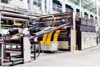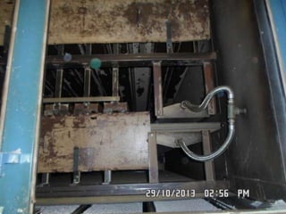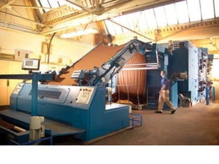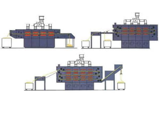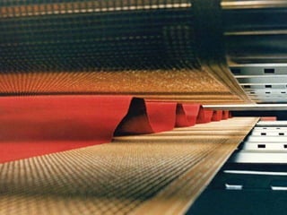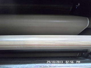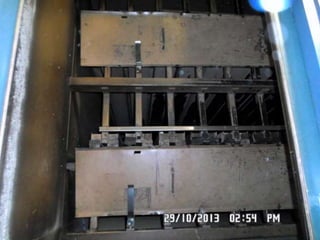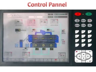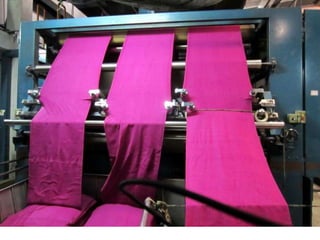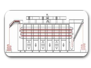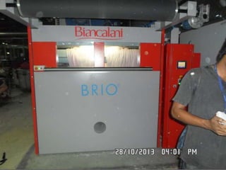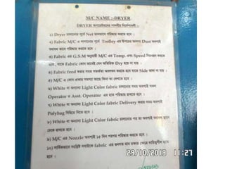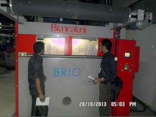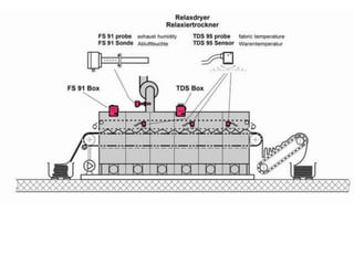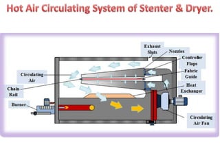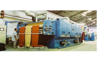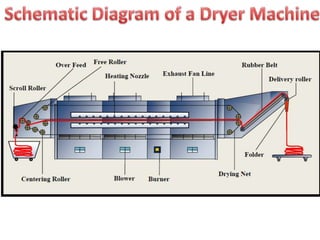 The document provides information about a drying machine used in textile processing. It contains details such as the machine having 2 chambers, 8 blowers, and 2 conveyors. It then explains that the machine removes residual water from fabric by applying heat through burner nozzles while continuously measuring humidity. The document further discusses parameters for operating the machine like temperature, speed, and overfeeding percentage which depend on factors like fabric type and weight. It also lists components of the machine and steps for cleaning and maintenance.