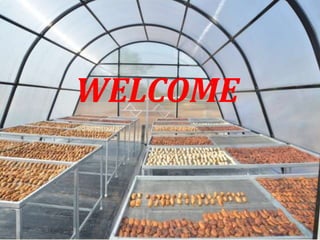 This document provides an overview of grain drying methods and dryer classification. It begins with an introduction to drying as a method for conditioning grains through moisture removal. Common drying methods are then described, including conduction, convection and radiation. Grain dryers are classified based on thin layer drying vs deep bed drying principles. Various mechanical dryer types are also outlined, including sack, rotary, continuous flow, tray, spray, freeze, vacuum, dielectric, electrical, infrared and fluidized bed dryers. Optimal moisture contents for storing different crops are listed. In conclusion, the document states that dryers play an important role in food security by allowing crops to be stored safely below their critical moisture levels.