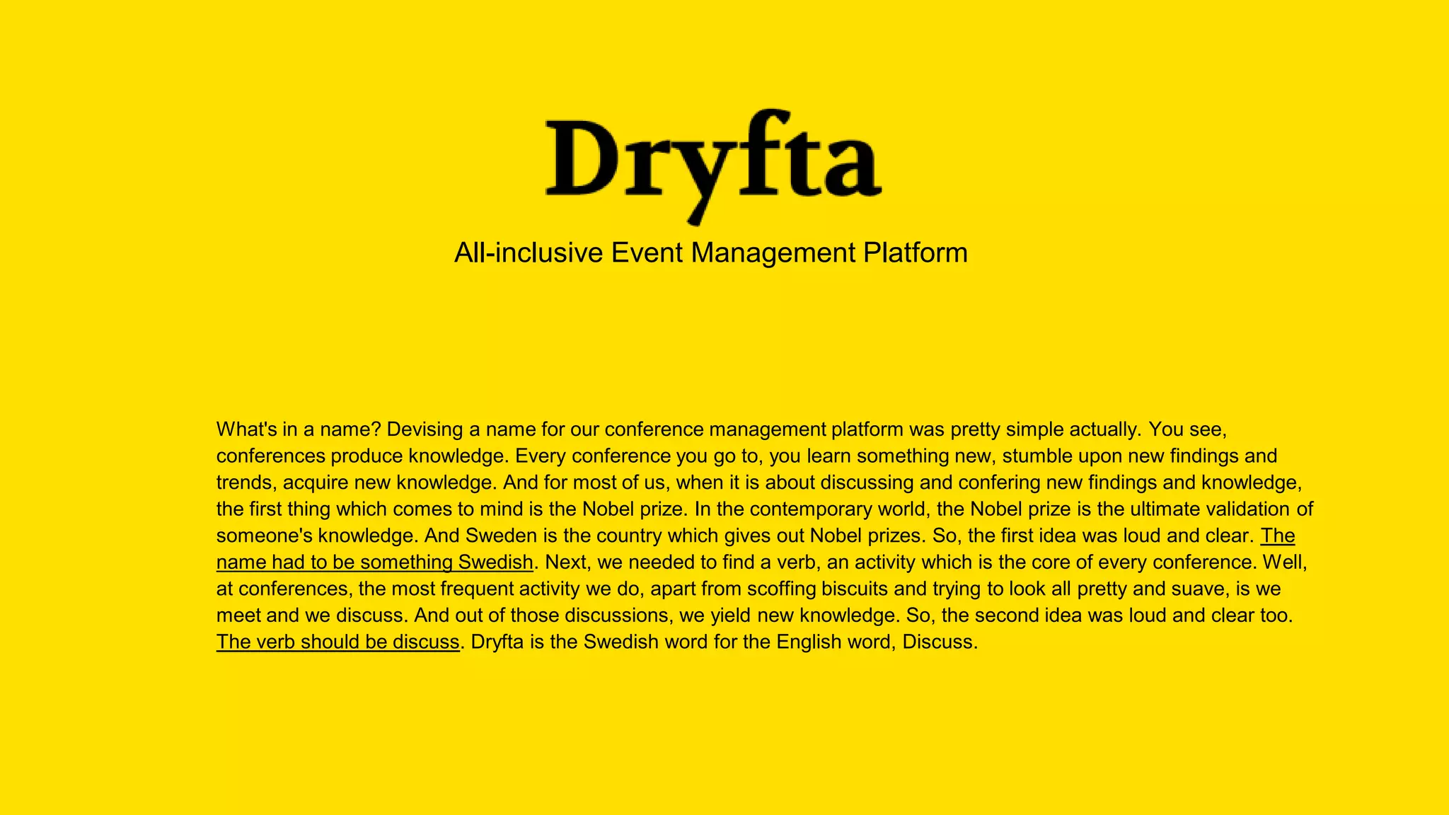 The document discusses naming a new conference management platform. It explains that conferences produce knowledge and the name should reflect this. The name chosen was Dryfta, a Swedish word meaning "to discuss". The platform will automate event processes to save organizers time and increase engagement and ROI. A minimum viable product launched successfully and they are now building out the full platform.