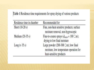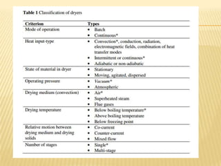 This document provides an overview of drying as an important unit operation in the pharmaceutical industry. It discusses the purposes of drying, different periods of drying, and classifications of dryers. It also describes several types of dryers commonly used in the pharmaceutical industry, including tray dryers, rotary dryers, fluidized bed dryers, freeze dryers, and dryers for slurries and suspensions. Special dryers like microwave and radio frequency dryers are also briefly mentioned.