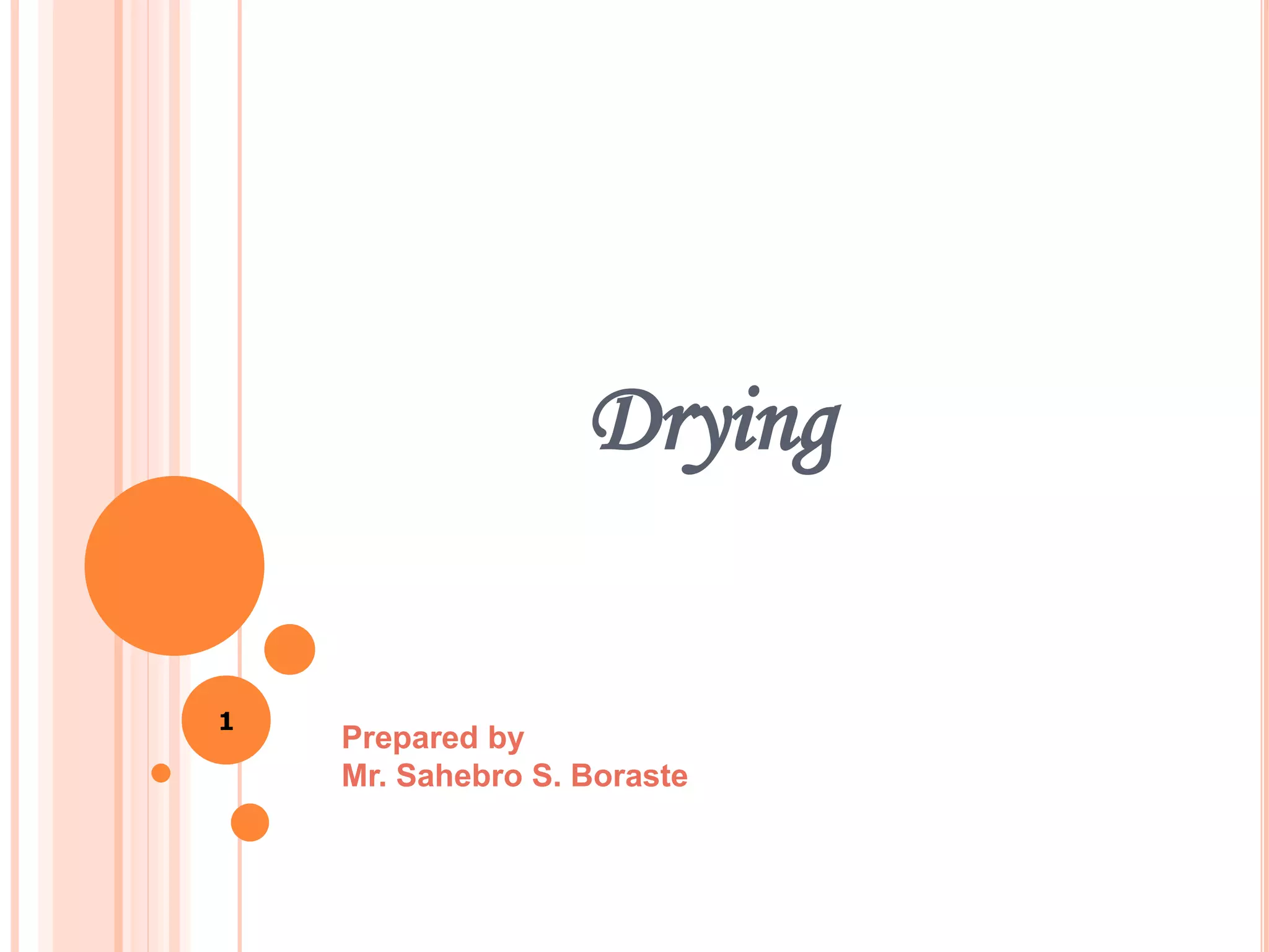 Drying is defined as the removal of water or other liquids from a material through the application of heat. It involves three steps: heat transfer to the material, mass transfer of moisture to the surface and evaporation, and transfer of vapor away from the material. There are several theories that describe the drying mechanism, including diffusion, capillarity, and pressure gradient theories. The drying rate curve shows an initial adjustment period, constant rate period, falling rate periods, and an equilibrium moisture content where drying stops. Factors like material properties, air conditions, and particle size influence the drying process and rate.