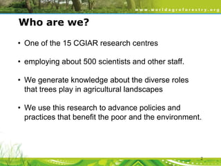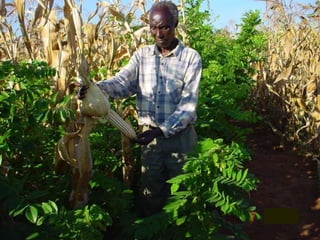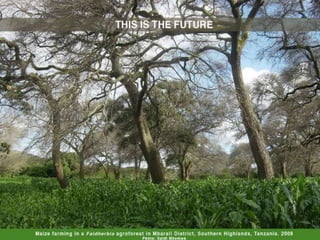 This document discusses agroforestry as an essential tool for climate resilience. It summarizes that by 2050, food production will need to increase 60% on the same land area while making farms more resilient to climate change and reducing greenhouse gas emissions. Agroforestry brings many benefits like increased soil fertility and crop yields through the use of fertilizer trees. Studies show agroforestry systems can produce higher yields than chemical fertilizers alone. Agroforestry also improves climate resilience by buffering weather impacts and storing large amounts of carbon in soils and trees. The document argues agroforestry is key to achieving food security and climate goals by 2050 by sustainably increasing production while reducing emissions and adapting to climate change.