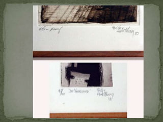 Drypoint is a printmaking technique that produces a softer line than etching. The artist scratches an image into a Plexiglass plate with a stylus, forming raised burrs of plexiglass. These burrs hold ink well initially but flatten with each pass through the printing press, limiting the number of high-quality prints that can be pulled from the plate. The document provides instructions for creating drypoint prints, including preparing the plate by drawing on Plexiglass, inking and printing the plate, and properly labeling proofs and editions.