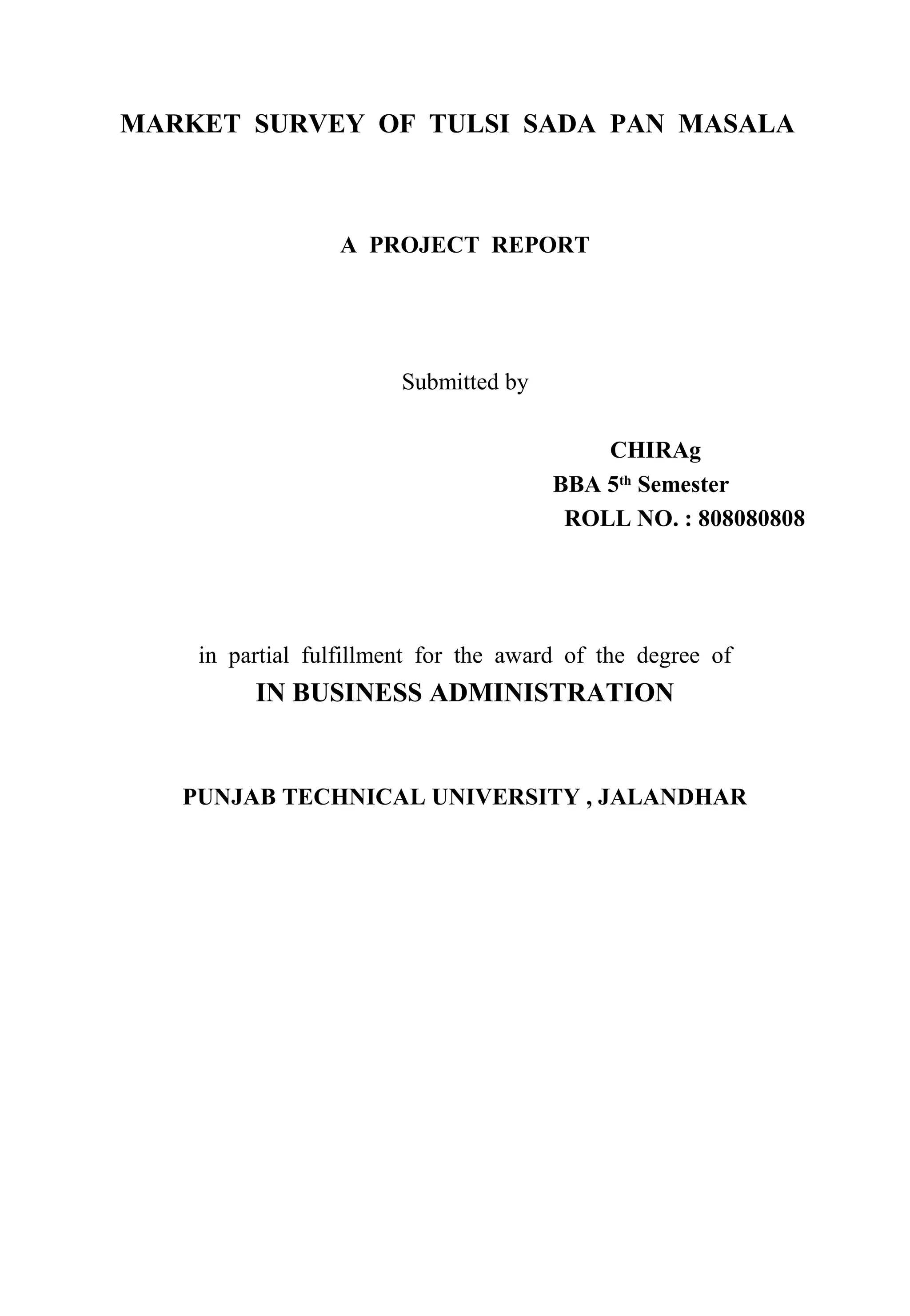 The document is a market survey report on Tulsi Sada pan masala conducted by Chiraj, a student at RIMT-IMCT, as part of their summer training project at D.S. Group. It provides an introduction to D.S. Group, which was founded in 1929 and has grown to become a Rs. 1600 crore conglomerate. It then outlines the objectives of the market survey, which was to analyze the market share and availability of Tulsi Sada in Saharanpur city relative to other brands. The document presents findings that Rajnigandha holds a major share of the tobacco market in Saharanpur due to its high quality and taste.