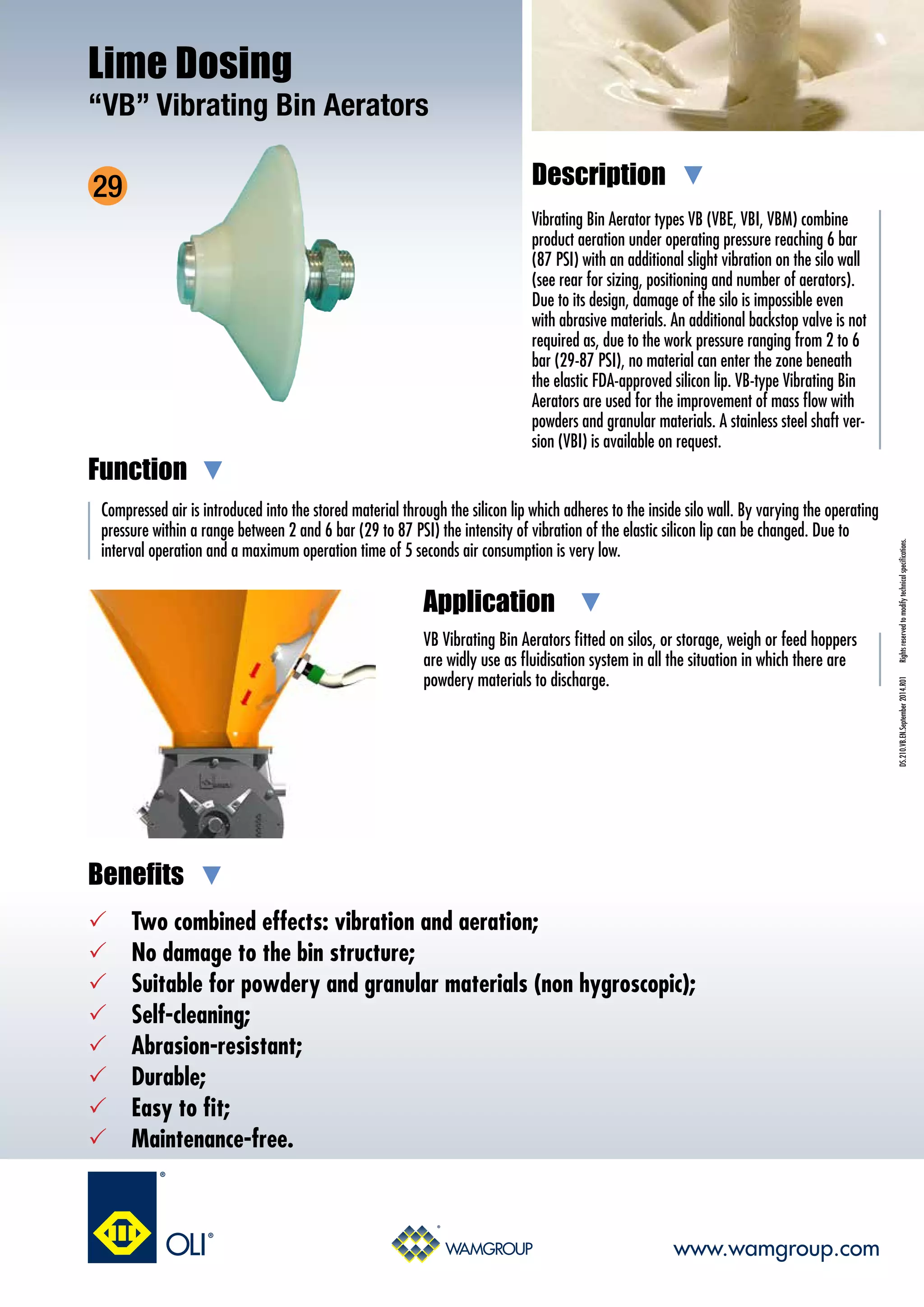 VB vibrating bin aerators combine product aeration under pressure up to 6 bar with slight vibration on silo walls. The aerators improve mass flow of powders and granular materials without damaging silos. Compressed air is introduced through a silicon lip adhered to the silo wall. Varying operating pressure from 2 to 6 bar changes the vibration intensity of the silicon lip. Air consumption is low due to interval operation up to 5 seconds.