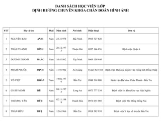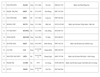 Danh sách chứa thông tin cá nhân của 37 người, bao gồm họ tên, giới tính, năm sinh, nơi sinh, số điện thoại và đơn vị công tác. Các cá nhân này chủ yếu làm việc tại các bệnh viện ở các tỉnh thành khác nhau trên cả nước. Một số thông tin cũng thiếu và không đồng nhất giữa các dòng.