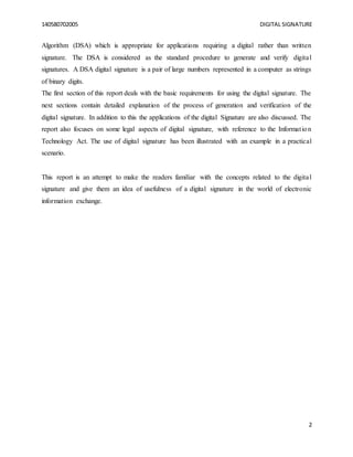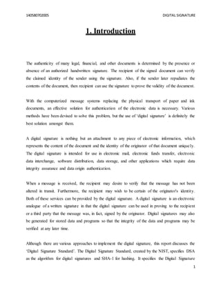 The document discusses digital signatures, which provide authentication of electronic documents and messages. Digital signatures use public key cryptography, with each user having a unique private key and corresponding public key. To generate a digital signature, a document's hash value is encrypted with the sender's private key. Recipients can verify the signature by decrypting the hash with the sender's public key and comparing it to a newly generated hash of the received document. This allows confirmation of the sender's identity and ensures the document has not been altered. The document outlines the basic digital signature process and requirements for using digital signatures to authenticate electronic information.